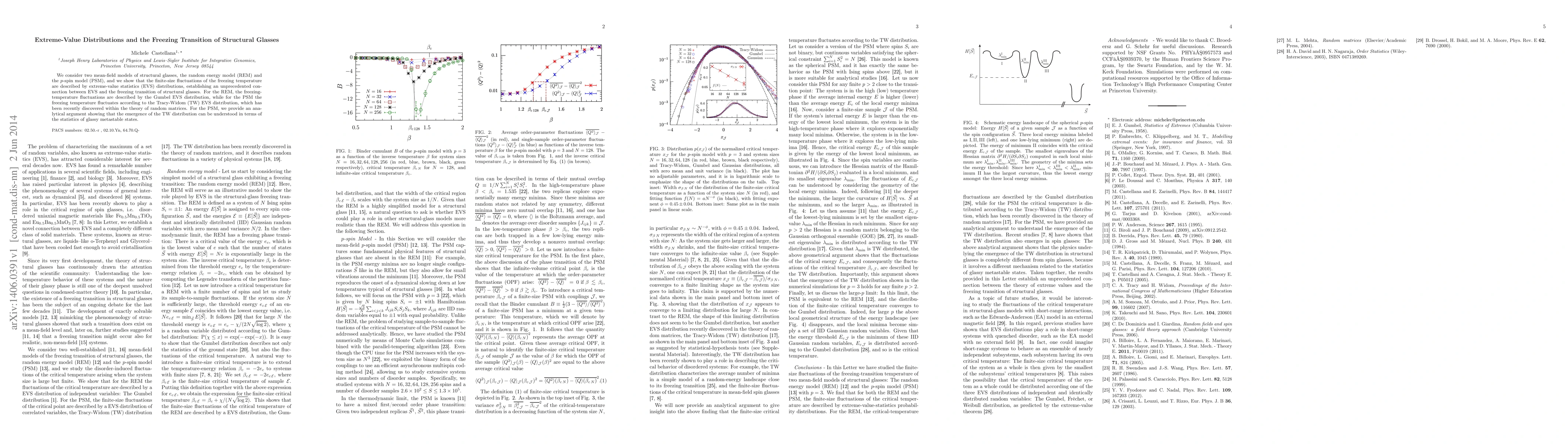 This paper establishes a novel link between extreme-value statistics and the freezing transition in structural glasses, demonstrating that the freezing temperature fluctuations in mean-field models like the REM and PSM follow Gumbel and Tracy-Widom distributions, respectively. It also provides an analytical explanation for the emergence of the Tracy-Widom distribution in the context of glassy metastable states.