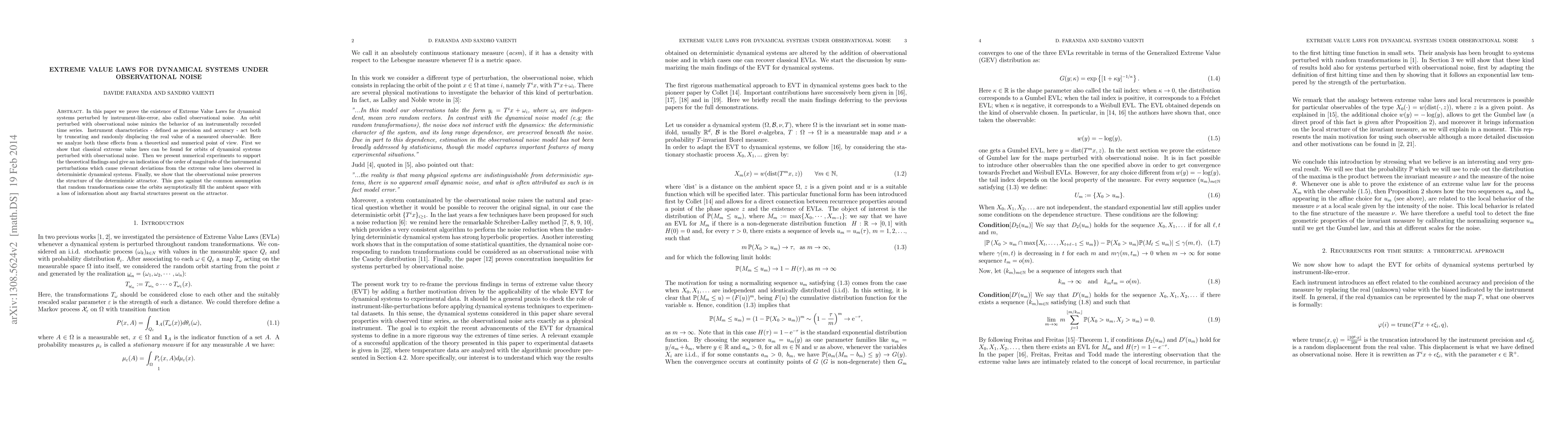 In this paper we prove the existence of Extreme Value Laws for dynamical systems perturbed by instrument-like-error, also called observational noise. An orbit perturbed with observational noise mimics the behavior of an instrumentally recorded time series. Instrument characteristics - defined as precision and accuracy - act both by truncating and randomly displacing the real value of a measured observable. Here we analyze both these effects from a theoretical and numerical point of view. First we show that classical extreme value laws can be found for orbits of dynamical systems perturbed with observational noise. Then we present numerical experiments to support the theoretical findings and give an indication of the order of magnitude of the instrumental perturbations which cause relevant deviations from the extreme value laws observed in deterministic dynamical systems. Finally, we show that the observational noise preserves the structure of the deterministic attractor. This goes against the common assumption that random transformations cause the orbits asymptotically fill the ambient space with a loss of information about any fractal structures present on the attractor.