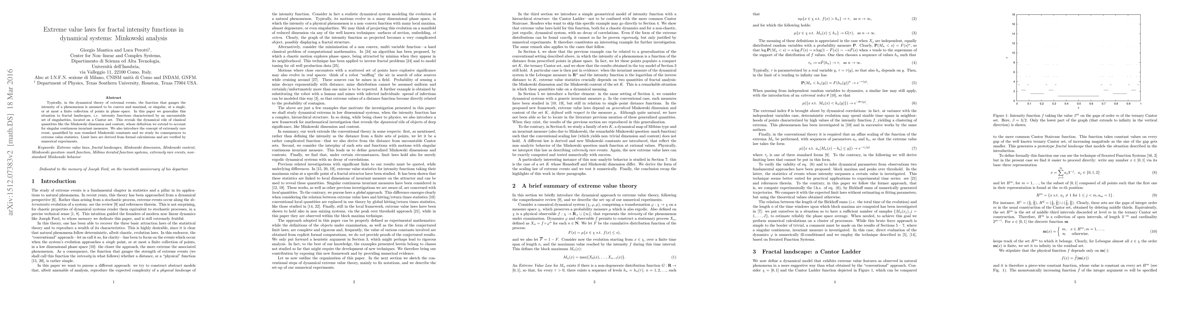 This paper introduces a new approach to modeling extreme value laws for fractal intensity functions in dynamical systems, extending classical quantities like Minkowski dimension and content to account for singular continuous invariant measures.