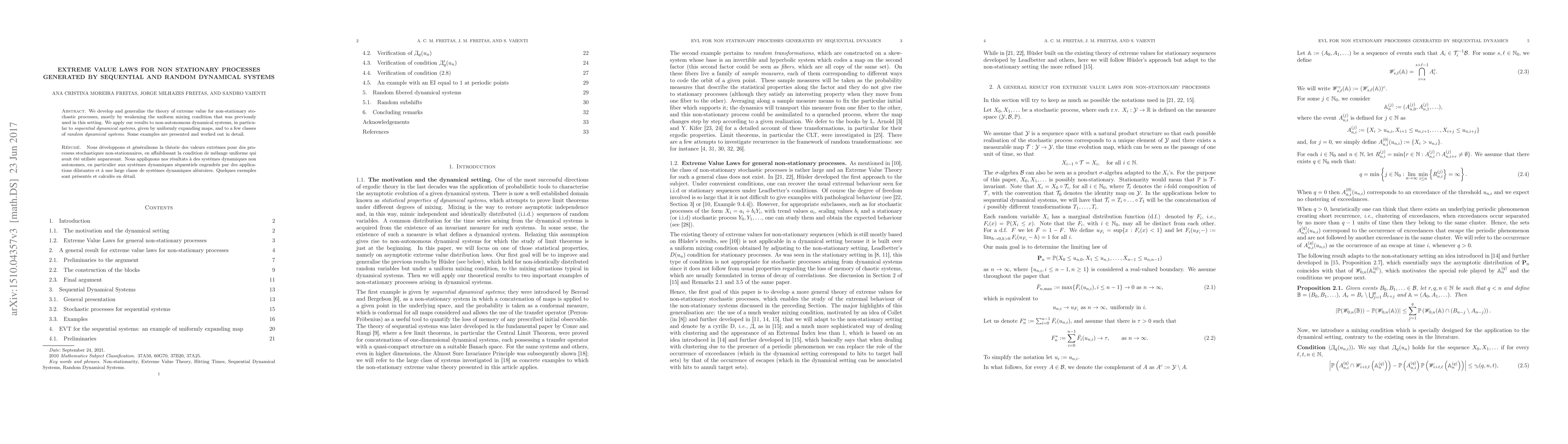 We develop and generalize the theory of extreme value for non-stationary stochastic processes, mostly by weakening the uniform mixing condition that was previously used in this setting. We apply our results to non-autonomous dynamical systems, in particular to {\em sequential dynamical systems}, given by uniformly expanding maps, and to a few classes of random dynamical systems. Some examples are presented and worked out in detail.