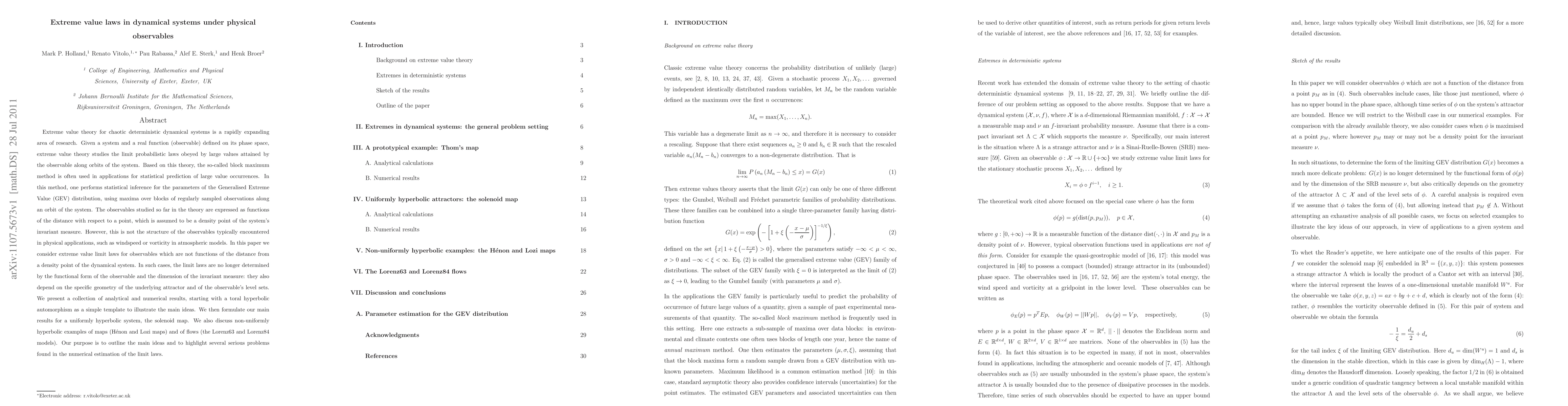 This paper explores extreme value laws in dynamical systems for observables not defined by distance from a density point, focusing on physical applications like windspeed and vorticity. It presents analytical and numerical results for various systems, highlighting the dependency of limit laws on both the geometry of the attractor and the observable's level sets, and discusses challenges in estimating these laws.