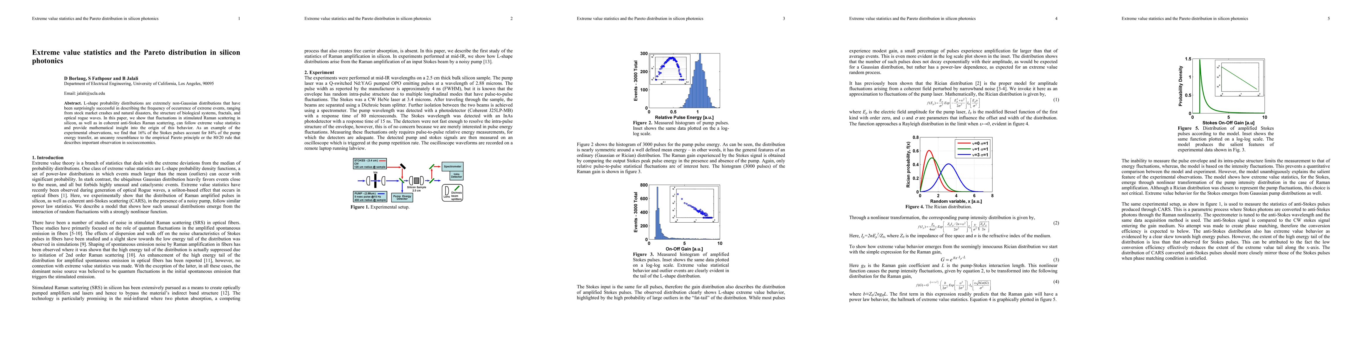 This paper investigates extreme value statistics in silicon photonics, demonstrating that fluctuations in stimulated Raman scattering follow non-Gaussian L-shape distributions, akin to the Pareto distribution. It highlights the 80/20 rule in experimental observations, where a small fraction of events accounts for a large proportion of the total energy transfer.