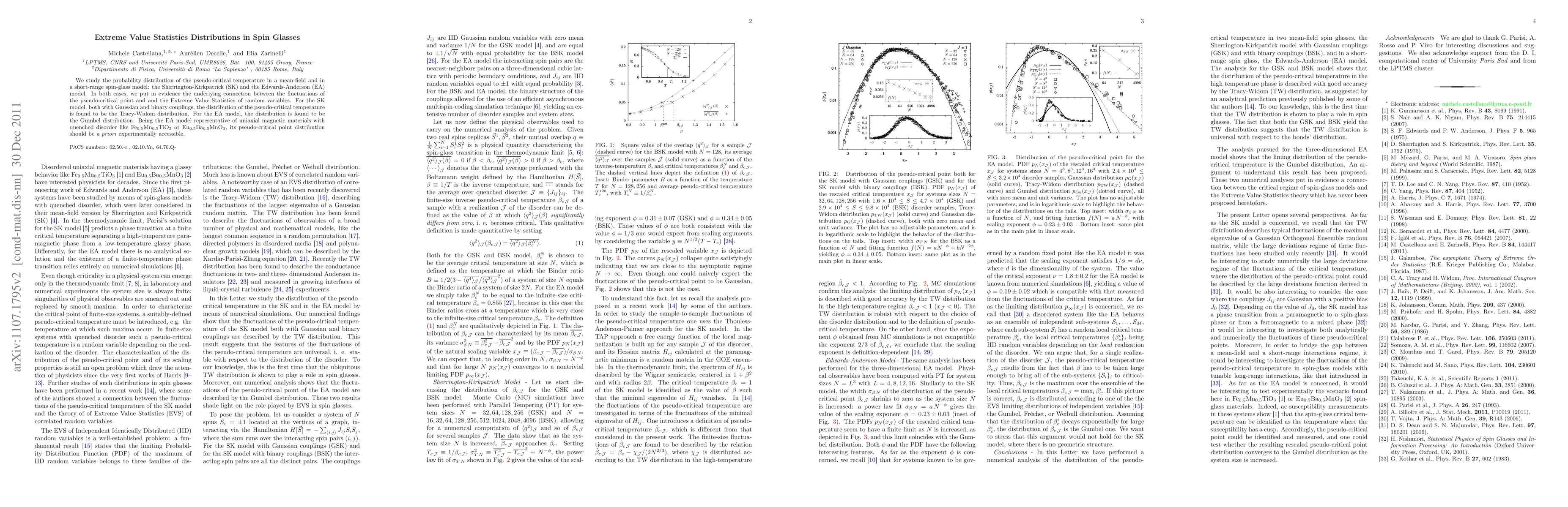 We study the probability distribution of the pseudo-critical temperature in a mean-field and in a short-range spin-glass model: the Sherrington-Kirkpatrick (SK) and the Edwards-Anderson (EA) model. In both cases, we put in evidence the underlying connection between the fluctuations of the pseudo-critical point and and the Extreme Value Statistics of random variables. For the SK model, both with Gaussian and binary couplings, the distribution of the pseudo-critical temperature is found to be the Tracy-Widom distribution. For the EA model, the distribution is found to be the Gumbel distribution. Being the EA model representative of uniaxial magnetic materials with quenched disorder like $Fe_{0.5} Mn_{0.5} Ti O_3$ or $Eu_{0.5} Ba_{0.5} Mn O_3$, its pseudo-critical point distribution should be a priori experimentally accessible.