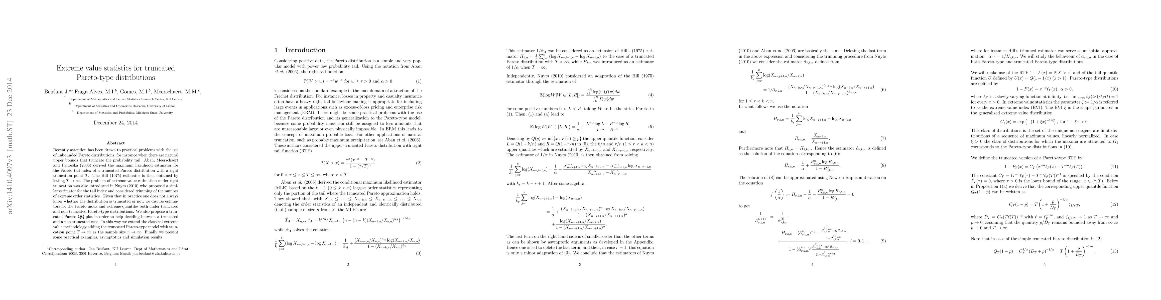This work unifies previous approaches for estimating the Pareto index under truncation, extends extreme value methodology to include truncated Pareto-type models, and proposes a truncated Pareto QQ-plot for model assessment.