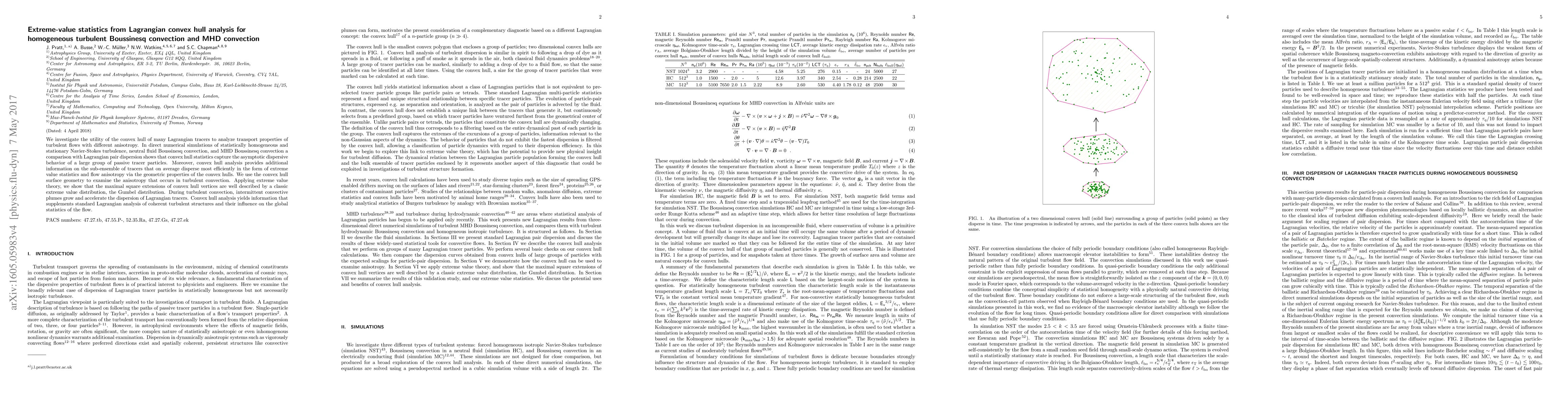 We investigate the utility of the convex hull of many Lagrangian tracers to analyze transport properties of turbulent flows with different anisotropy. In direct numerical simulations of statistically homogeneous and stationary Navier-Stokes turbulence, neutral fluid Boussinesq convection, and MHD Boussinesq convection a comparison with Lagrangian pair dispersion shows that convex hull statistics capture the asymptotic dispersive behavior of a large group of passive tracer particles. Moreover, convex hull analysis provides additional information on the sub-ensemble of tracers that on average disperse most efficiently in the form of extreme value statistics and flow anisotropy via the geometric properties of the convex hulls. We use the convex hull surface geometry to examine the anisotropy that occurs in turbulent convection. Applying extreme value theory, we show that the maximal square extensions of convex hull vertices are well described by a classic extreme value distribution, the Gumbel distribution. During turbulent convection, intermittent convective plumes grow and accelerate the dispersion of Lagrangian tracers. Convex hull analysis yields information that supplements standard Lagrangian analysis of coherent turbulent structures and their influence on the global statistics of the flow.