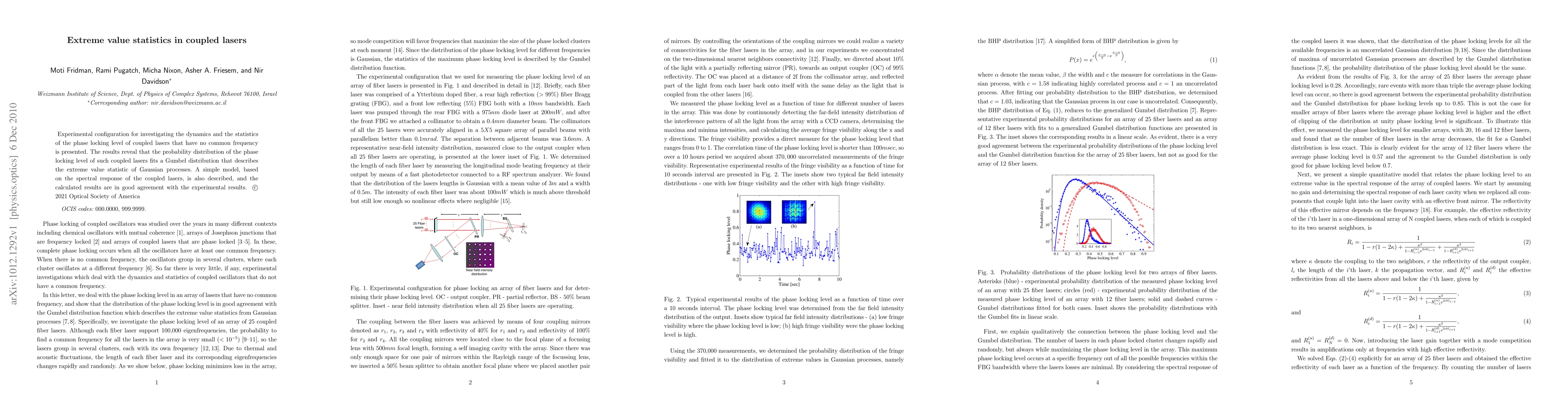 Experimental configuration for investigating the dynamics and the statistics of the phase locking level of coupled lasers that have no common frequency is presented. The results reveal that the probability distribution of the phase locking level of such coupled lasers fits a Gumbel distribution that describes the extreme value statistic of Gaussian processes. A simple model, based on the spectral response of the coupled lasers, is also described, and the calculated results are in good agreement with the experimental results.