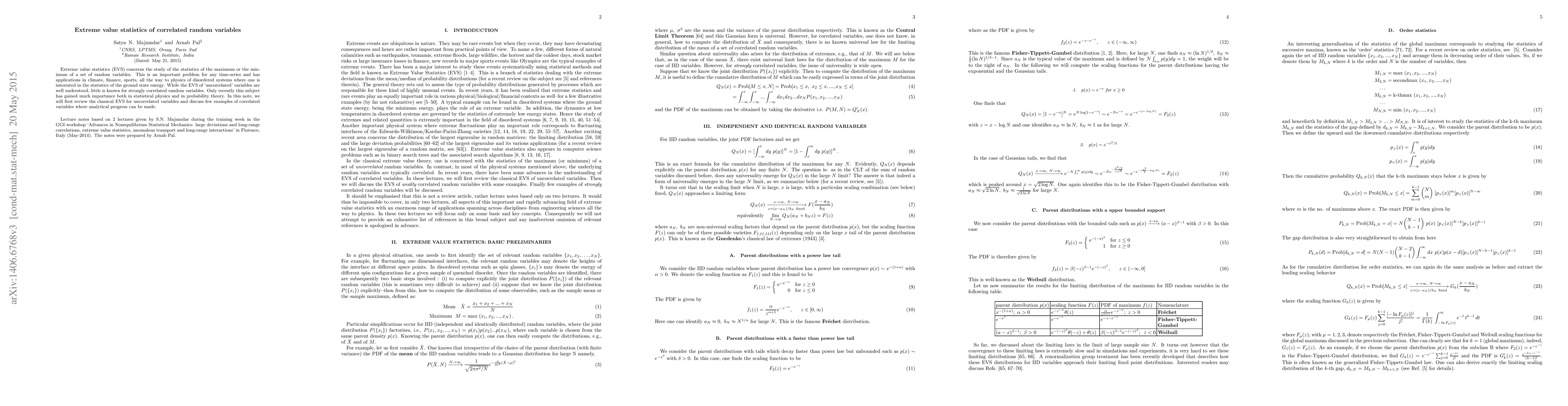 This paper reviews extreme value statistics for uncorrelated random variables and explores recent advances in understanding the statistics of extremes in strongly correlated random variables, highlighting applications across various fields from climate to physics.
