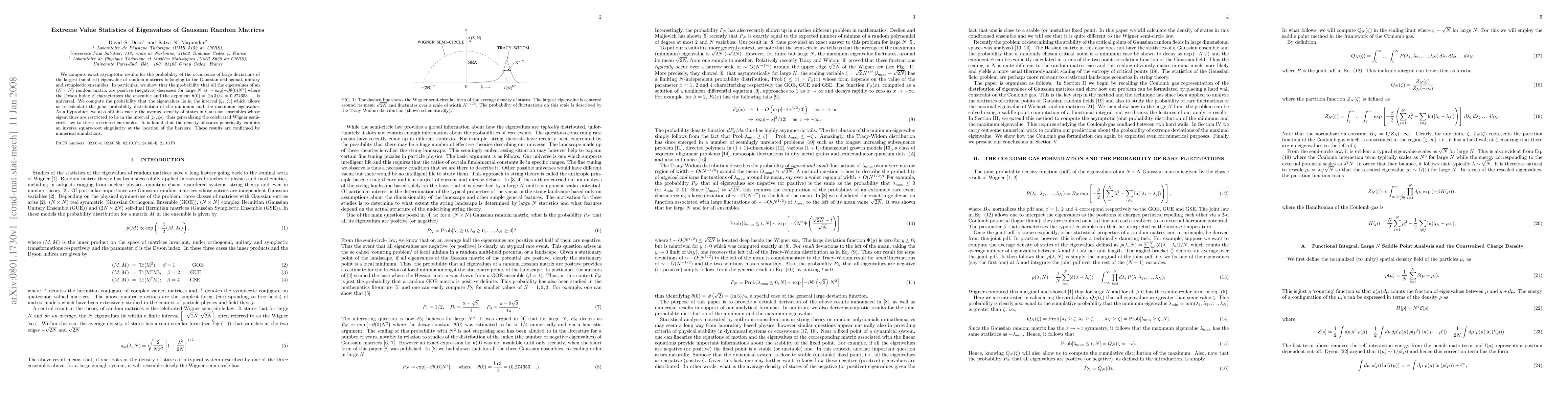 We compute exact asymptotic results for the probability of the occurrence of large deviations of the largest (smallest) eigenvalue of random matrices belonging to the Gaussian orthogonal, unitary and symplectic ensembles. In particular, we show that the probability that all the eigenvalues of an (NxN) random matrix are positive (negative) decreases for large N as ~\exp[-\beta \theta(0) N^2] where the Dyson index \beta characterizes the ensemble and the exponent \theta(0)=(\ln 3)/4=0.274653... is universal. We compute the probability that the eigenvalues lie in the interval [\zeta_1,\zeta_2] which allows us to calculate the joint probability distribution of the minimum and the maximum eigenvalue. As a byproduct, we also obtain exactly the average density of states in Gaussian ensembles whose eigenvalues are restricted to lie in the interval [\zeta_1,\zeta_2], thus generalizing the celebrated Wigner semi-circle law to these restricted ensembles. It is found that the density of states generically exhibits an inverse square-root singularity at the location of the barriers. These results are confirmed by numerical simulations.