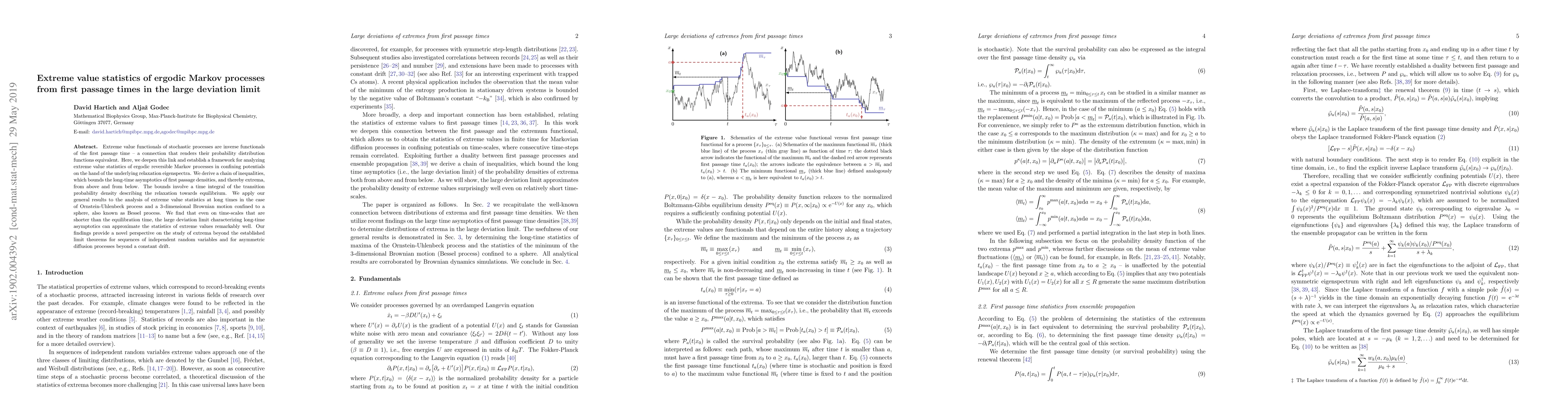 This paper establishes a framework for analyzing extreme value statistics in ergodic reversible Markov processes using first passage times and large deviation principles. It derives bounds for the long-time asymptotics of first passage densities and applies these to the Ornstein-Uhlenbeck process and 3D Brownian motion on a sphere, demonstrating the effectiveness of the large deviation limit in approximating extreme value statistics.