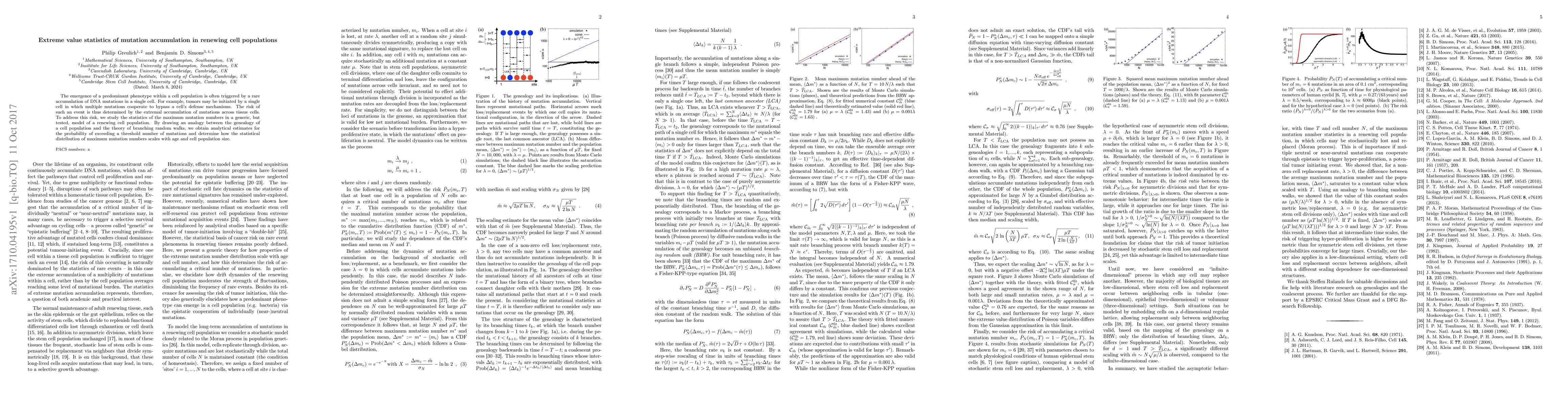 This paper investigates the statistical behavior of the maximum number of DNA mutations in renewing cell populations, using a model that draws on branching random walks. It provides analytical estimates for the probability of rare mutation accumulation events, such as the initiation of tumors, and examines how the distribution of these mutations scales with age and population size.