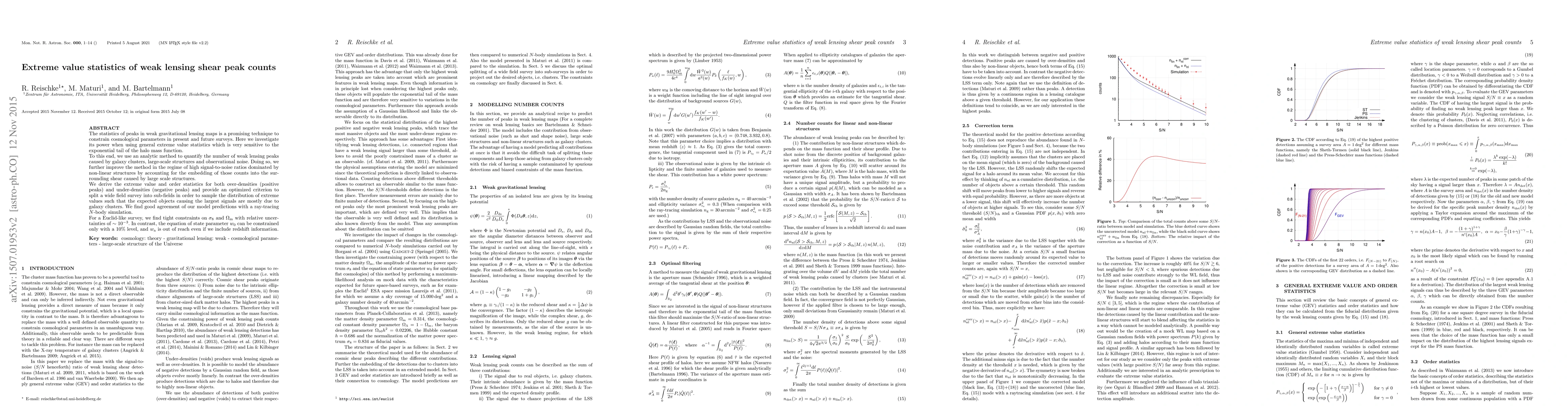 This paper explores the extreme value statistics of weak lensing shear peak counts to constrain cosmological parameters, particularly $\sigma_8$ and $\Omega_\text{m}$, using an improved method that accounts for non-linear structures and observational noise. The study finds tight constraints on $\sigma_8$ and $\Omega_\text{m}$ with relative uncertainties of $\sim 10^{-3}$ for a Euclid-like survey.