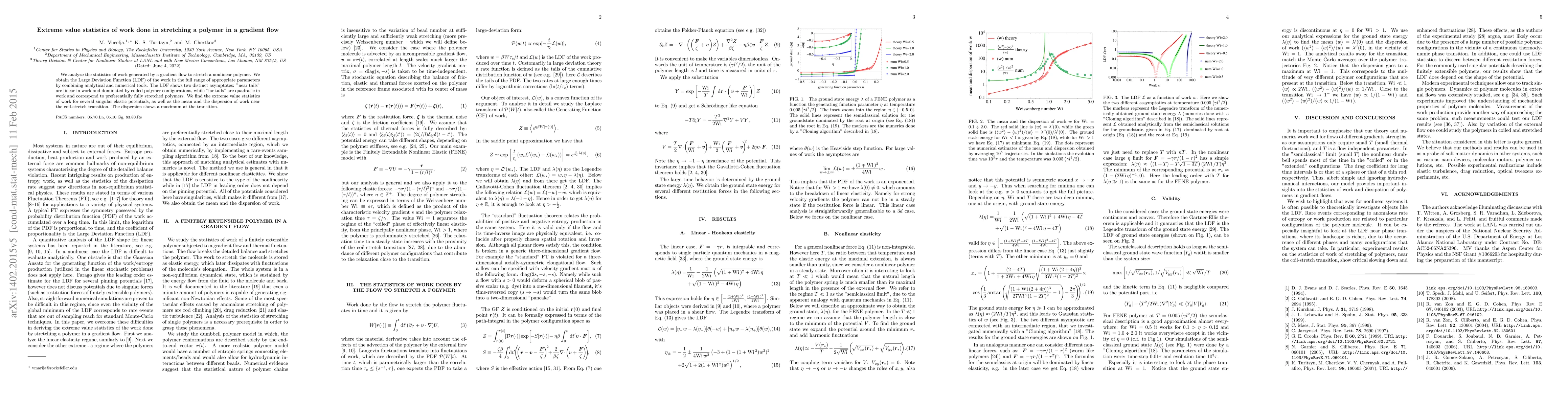 A study on stretching a nonlinear polymer in a gradient flow reveals two distinct asymptotes for work statistics: near tails dominated by coiled configurations and far tails corresponding to fully stretched polymers.