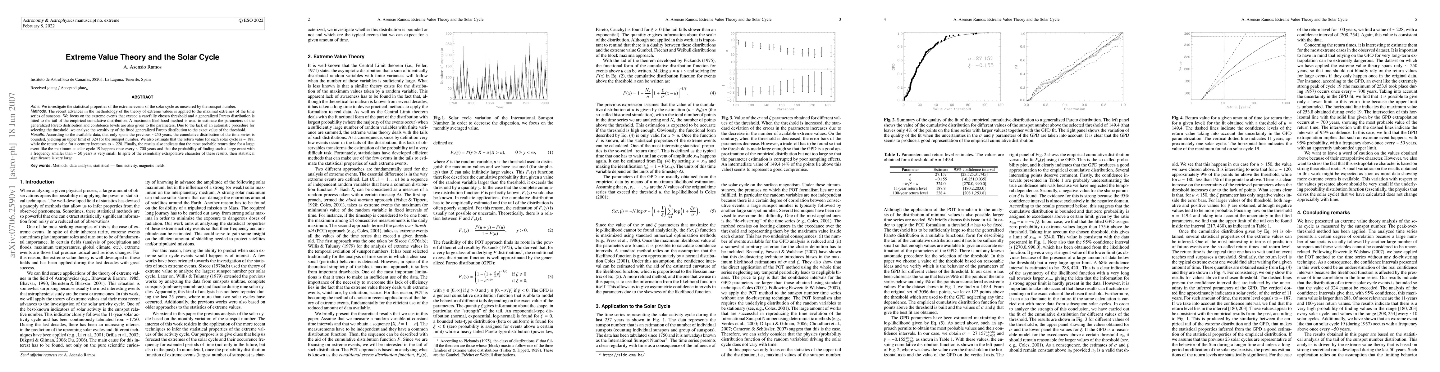 The research paper investigates extreme value theory applied to sunspot numbers, finding that large events occur approximately every 188 years and the probability of such an event is small, with a frequency smaller than 50 years being very unlikely.