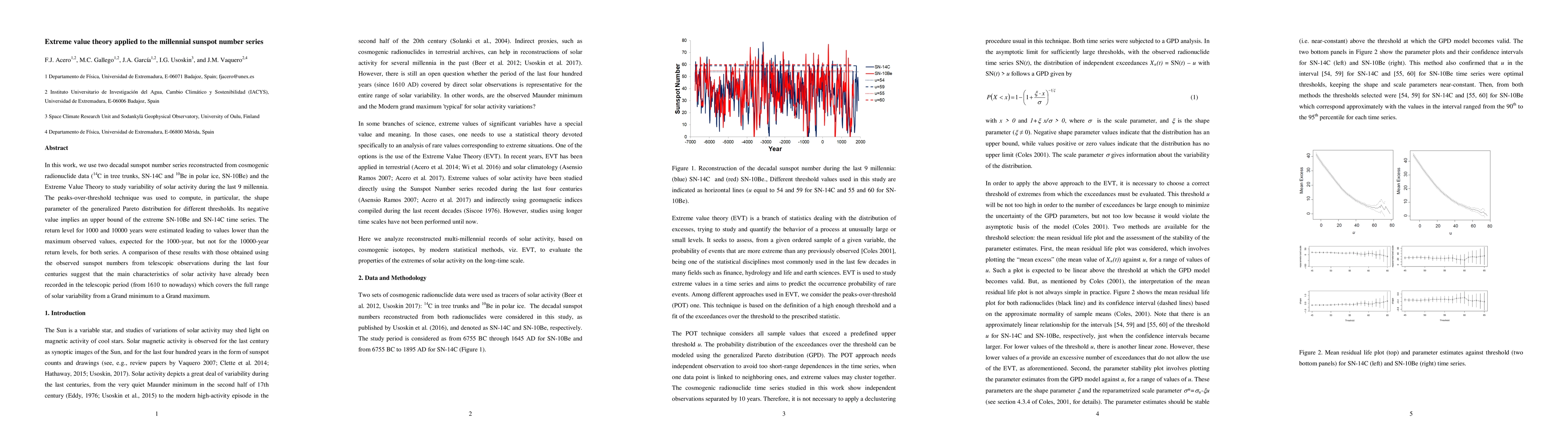This paper applies Extreme Value Theory to two decadal sunspot number series reconstructed from cosmogenic radionuclide data to study solar activity variability over the last 9 millennia. The study finds an upper bound for extreme values and estimates return levels, suggesting that the main solar activity characteristics observed telescopically since 1610 have already been recorded.
