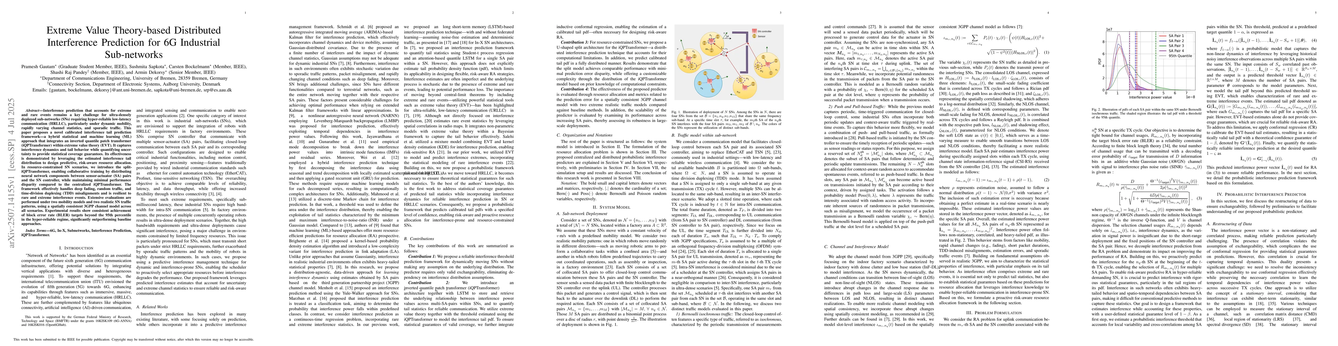 Interference prediction that accounts for extreme and rare events remains a key challenge for ultra-densely deployed sub-networks (SNs) requiring hyper-reliable low-latency communication (HRLLC), particularly under dynamic mobility, rapidly varying channel statistics, and sporadic traffic. This paper proposes a novel calibrated interference tail prediction framework, a hybrid statistical and machine learning (ML) approach that integrates an inverted quantile patch transformer (iQPTransformer) within extreme value theory (EVT). It captures interference dynamics and tail behavior while quantifying uncertainty to provide statistical coverage guarantees. Its effectiveness is demonstrated by leveraging the estimated interference tail distribution to design predictive, risk-aware resource allocation. In resource-constrained SN scenarios, we introduce the split-iQPTransformer, enabling collaborative training by distributing neural network components between sensor-actuator (SA) pairs and the SN controller, while maintaining minimal performance disparity compared to the centralized iQPTransformer. The framework effectively handles deep fading, random traffic, and time-division duplexing (TDD) misalignments and is resilient to rare and extreme interference events. Extensive evaluations are performed under two mobility models and two realistic SN traffic patterns, using a spatially consistent 3GPP channel model across all scenarios. Experimental results show consistent achievement of block error rate (BLER) targets beyond the 95th percentile in the hyper-reliable regime, significantly outperforming baseline approaches.