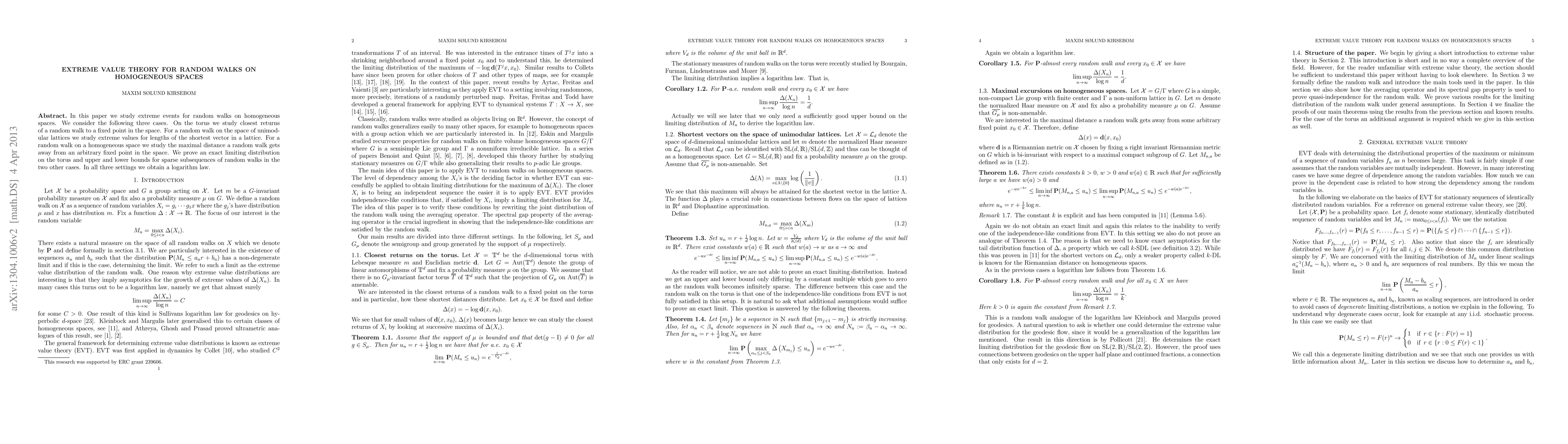 This paper investigates extreme value theory for random walks on homogeneous spaces, focusing on three cases: closest returns on the torus, shortest vector lengths in unimodular lattices, and maximal distances from a fixed point in general homogeneous spaces. It establishes an exact limiting distribution on the torus and provides bounds for the other two cases, revealing a common logarithmic law across all settings.