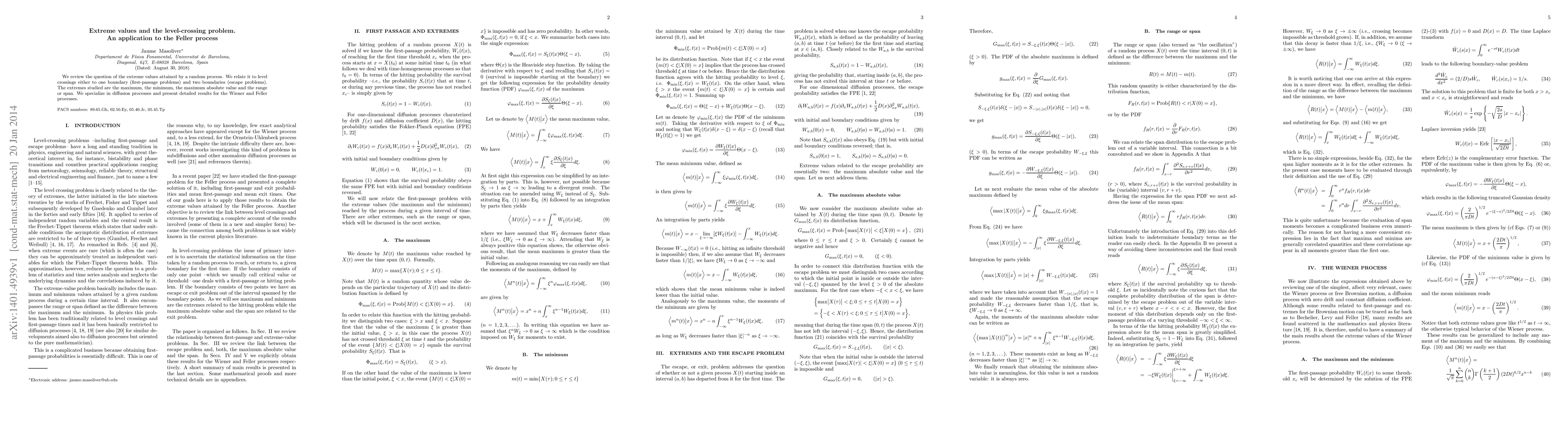 This paper reviews extreme value theory in random processes, focusing on the level-crossing problem for both one and two boundaries. It provides detailed results for the maximum, minimum, and range of Wiener and Feller diffusion processes.