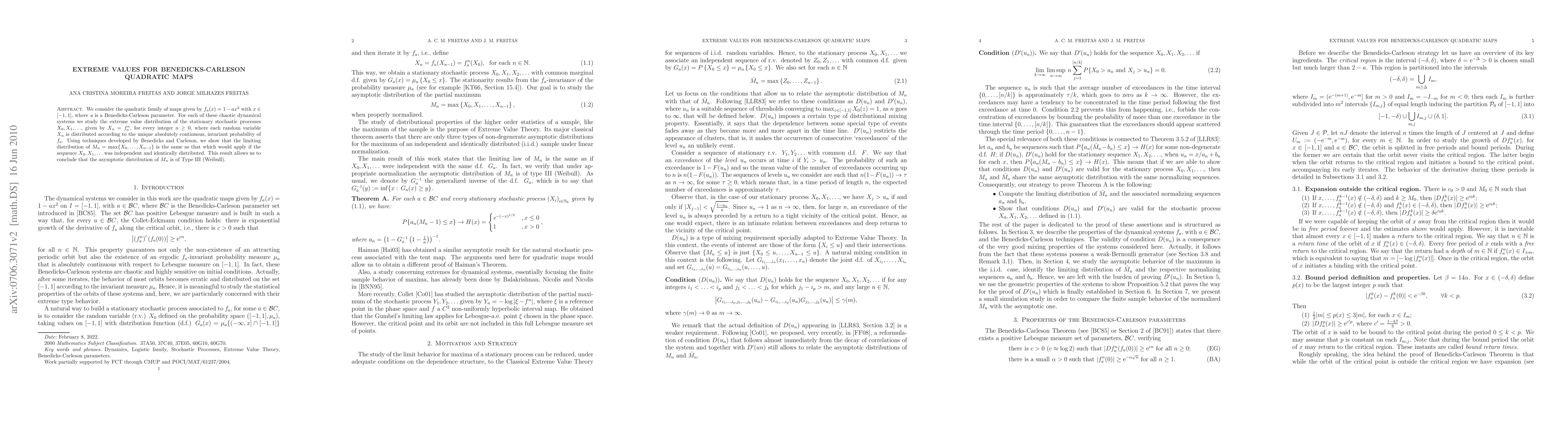 We consider the quadratic family of maps given by $f_{a}(x)=1-a x^2$ with $x\in [-1,1]$, where $a$ is a Benedicks-Carleson parameter. For each of these chaotic dynamical systems we study the extreme value distribution of the stationary stochastic processes $X_0,X_1,...$, given by $X_{n}=f_a^n$, for every integer $n\geq0$, where each random variable $X_n$ is distributed according to the unique absolutely continuous, invariant probability of $f_a$. Using techniques developed by Benedicks and Carleson, we show that the limiting distribution of $M_n=\max\{X_0,...,X_{n-1}\}$ is the same as that which would apply if the sequence $X_0,X_1,...$ was independent and identically distributed. This result allows us to conclude that the asymptotic distribution of $M_n$ is of Type III (Weibull).