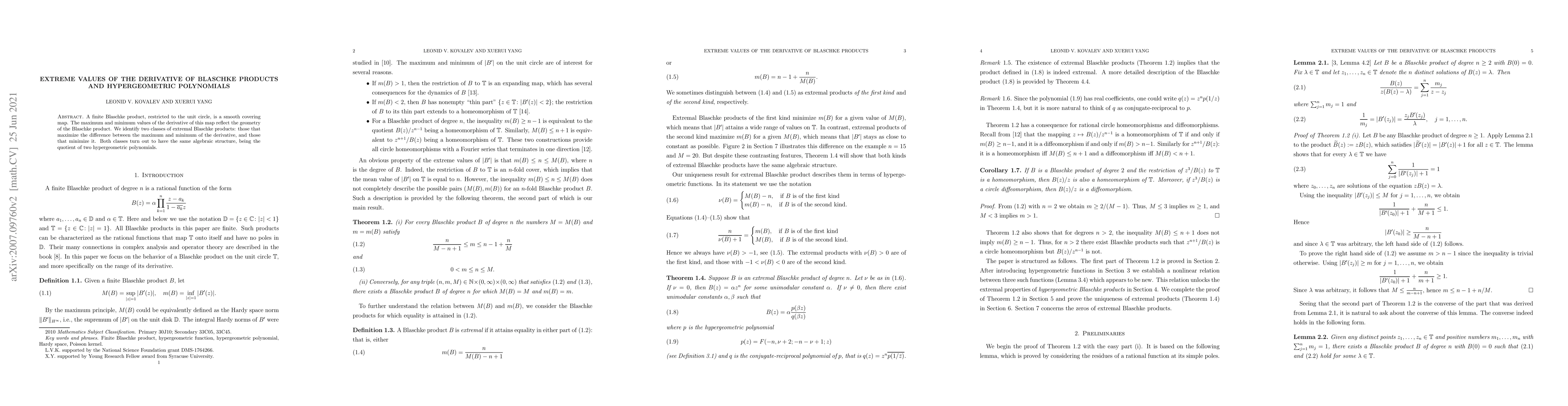 A finite Blaschke product, restricted to the unit circle, is a smooth covering map. The maximum and minimum values of the derivative of this map reflect the geometry of the Blaschke product. We identify two classes of extremal Blaschke products: those that maximize the difference between the maximum and minimum of the derivative, and those that minimize it. Both classes turn out to have the same algebraic structure, being the quotient of two hypergeometric polynomials.