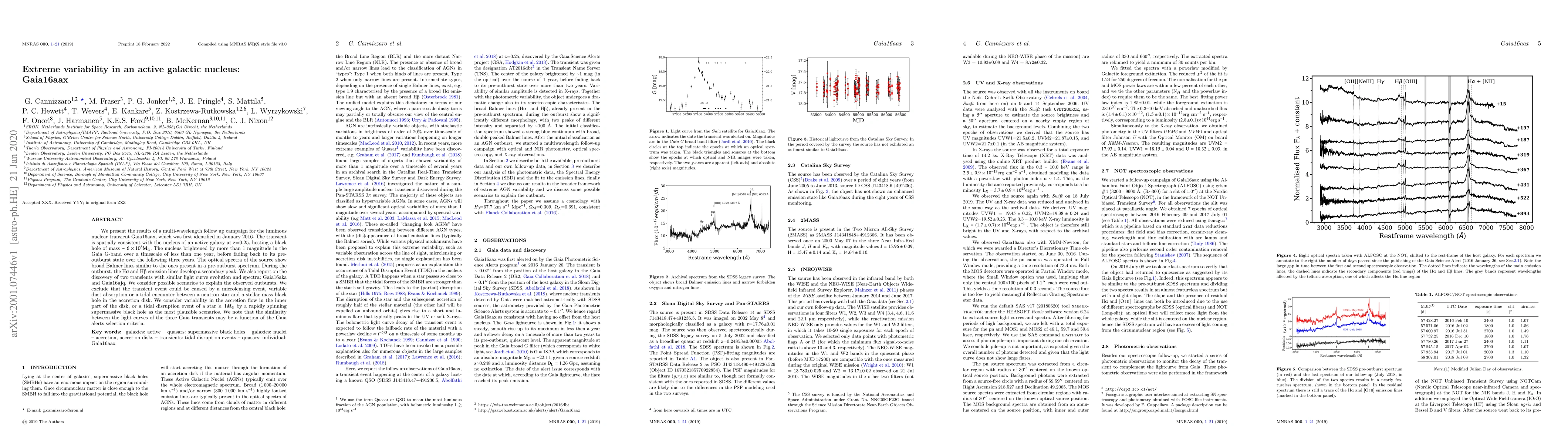 We present the results of a multi-wavelength follow up campaign for the luminous nuclear transient Gaia16aax, which was first identified in January 2016. The transient is spatially consistent with the nucleus of an active galaxy at z=0.25, hosting a black hole of mass $\rm \sim6\times10^8M_\odot$. The nucleus brightened by more than 1 magnitude in the Gaia G-band over a timescale of less than one year, before fading back to its pre-outburst state over the following three years. The optical spectra of the source show broad Balmer lines similar to the ones present in a pre-outburst spectrum. During the outburst, the $\rm H\alpha$ and $\rm H\beta$ emission lines develop a secondary peak. We also report on the discovery of two transients with similar light curve evolution and spectra: Gaia16aka and Gaia16ajq. We consider possible scenarios to explain the observed outbursts. We exclude that the transient event could be caused by a microlensing event, variable dust absorption or a tidal encounter between a neutron star and a stellar mass black hole in the accretion disk. We consider variability in the accretion flow in the inner part of the disk, or a tidal disruption event of a star $\geq 1 M_{\odot}$ by a rapidly spinning supermassive black hole as the most plausible scenarios. We note that the similarity between the light curves of the three Gaia transients may be a function of the Gaia alerts selection criteria.