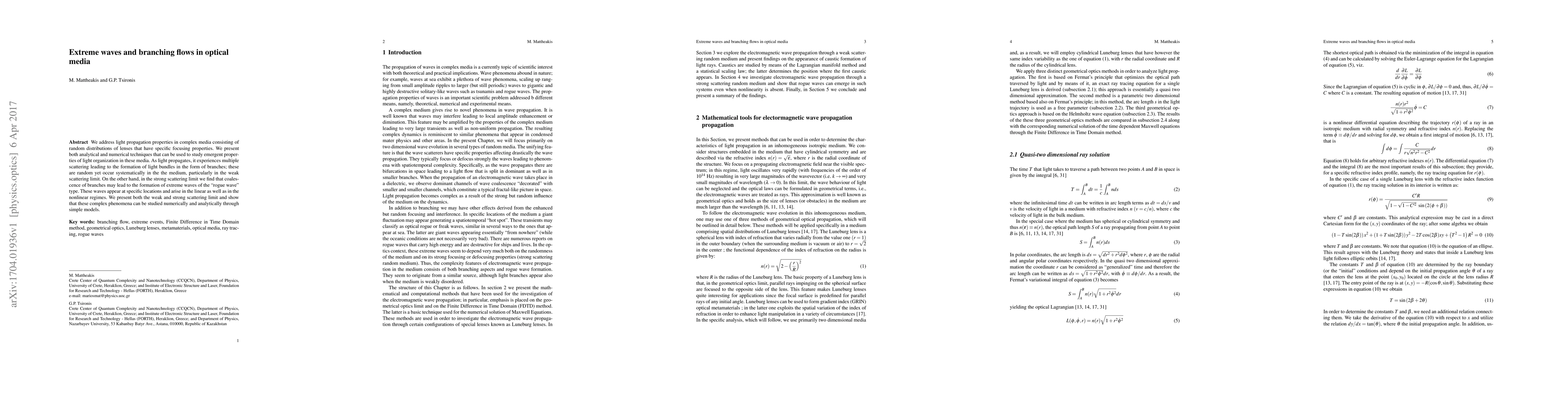 We address light propagation properties in complex media consisting of random distributions of lenses that have specific focusing properties. We present both analytical and numerical techniques that can be used to study emergent properties of light organization in these media. As light propagates, it experiences multiple scattering leading to the formation of light bundles in the form of branches; these are random yet occur systematically in the the medium, particularly in the weak scattering limit. On the other hand, in the strong scattering limit we find that coalescence of branches may lead to the formation of extreme waves of the "rogue wave" type. These waves appear at specific locations and arise in the linear as well as in the nonlinear regimes. We present both the weak and strong scattering limit and show that these complex phenomena can be studied numerically and analytically through simple models.