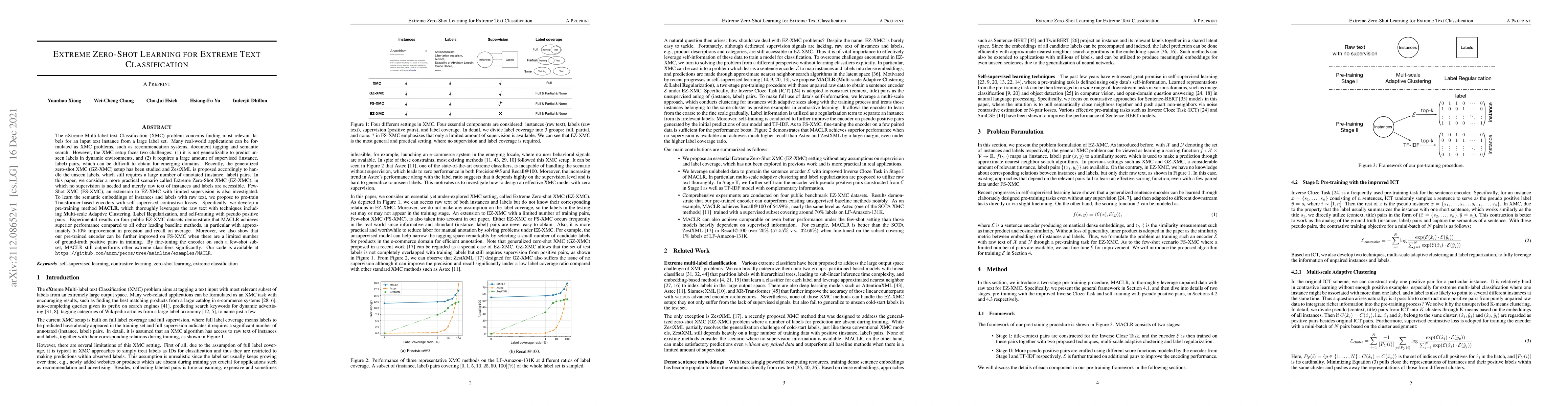 This paper introduces Extreme Zero-Shot XMC (EZ-XMC), a novel approach that requires no labeled data to predict unseen labels for text classification, and proposes MACLR for pre-training Transformer-based encoders with self-supervised contrastive losses. Experimental results show MACLR achieves superior performance with significant improvements in precision and recall on multiple datasets.