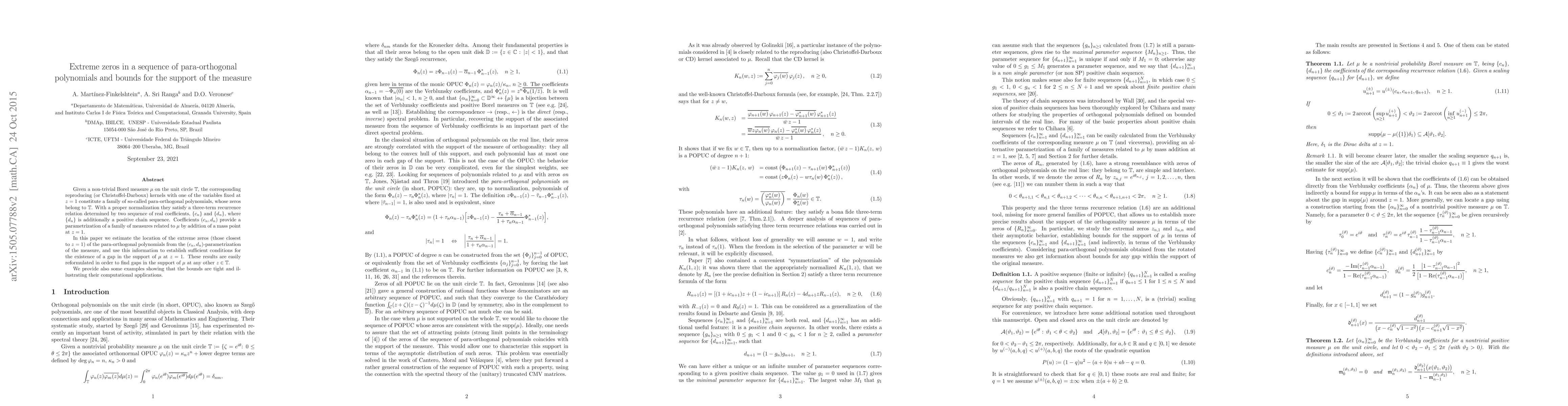 This paper investigates the extreme zeros of para-orthogonal polynomials associated with a Borel measure on the unit circle, deriving bounds for the support of the measure based on the coefficients of the polynomials. It establishes sufficient conditions for gaps in the support of the measure at specific points on the unit circle.