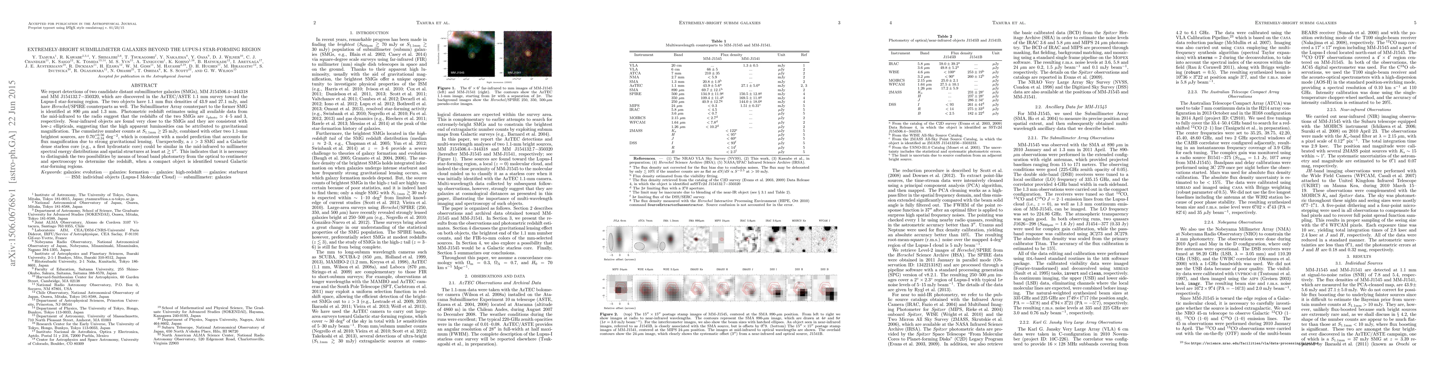 We report detections of two candidate distant submillimeter galaxies (SMGs), MM J154506.4$-$344318 and MM J154132.7$-$350320, which are discovered in the AzTEC/ASTE 1.1 mm survey toward the Lupus-I star-forming region. The two objects have 1.1 mm flux densities of 43.9 and 27.1 mJy, and have Herschel/SPIRE counterparts as well. The Submillimeter Array counterpart to the former SMG is identified at 890 $\mu$m and 1.3 mm. Photometric redshift estimates using all available data from the mid-infrared to the radio suggest that the redshifts of the two SMGs are $z_{\rm photo} \simeq$ 4-5 and 3, respectively. Near-infrared objects are found very close to the SMGs and they are consistent with low-$z$ ellipticals, suggesting that the high apparent luminosities can be attributed to gravitational magnification. The cumulative number counts at $S_{\rm 1.1mm} \ge 25$ mJy, combined with other two 1.1-mm brightest sources, are $0.70 ^{+0.56}_{-0.34}$ deg$^{-2}$, which is consistent with a model prediction that accounts for flux magnification due to strong gravitational lensing. Unexpectedly, a $z > 3$ SMG and a Galactic dense starless core (e.g., a first hydrostatic core) could be similar in the mid-infrared to millimeter spectral energy distributions and spatial structures at least at $\gtrsim 1"$. This indicates that it is necessary to distinguish the two possibilities by means of broad band photometry from the optical to centimeter and spectroscopy to determine the redshift, when a compact object is identified toward Galactic star-forming regions.