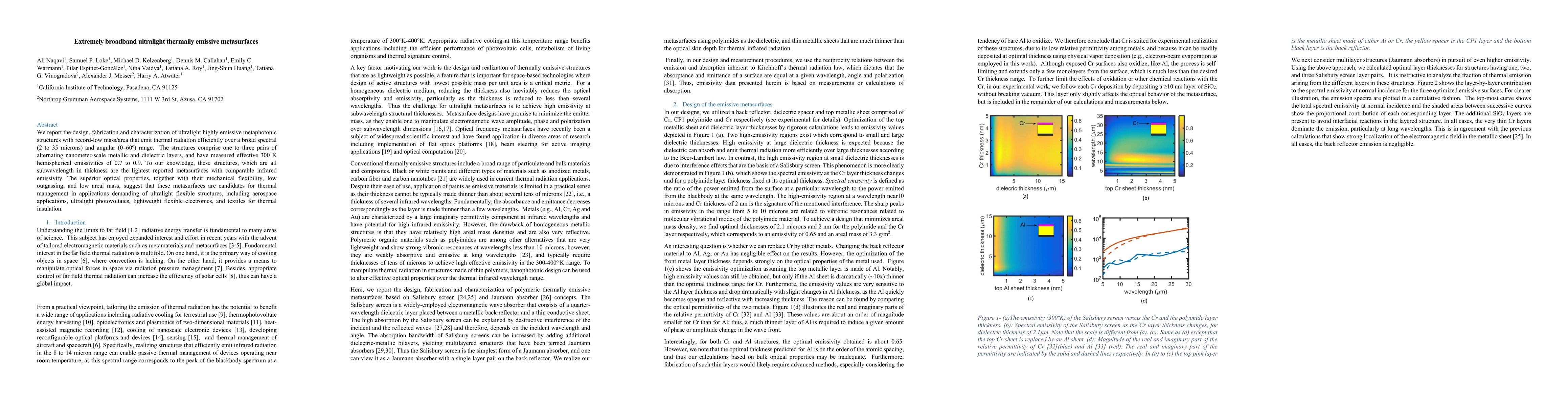 We report the design, fabrication and characterization of ultralight highly emissive metaphotonic structures with record-low mass/area that emit thermal radiation efficiently over a broad spectral (2 to 35 microns) and angular (0-60 degrees) range. The structures comprise one to three pairs of alternating nanometer-scale metallic and dielectric layers, and have measured effective 300 K hemispherical emissivities of 0.7 to 0.9. To our knowledge, these structures, which are all subwavelength in thickness are the lightest reported metasurfaces with comparable infrared emissivity. The superior optical properties, together with their mechanical flexibility, low outgassing, and low areal mass, suggest that these metasurfaces are candidates for thermal management in applications demanding of ultralight flexible structures, including aerospace applications, ultralight photovoltaics, lightweight flexible electronics, and textiles for thermal insulation.