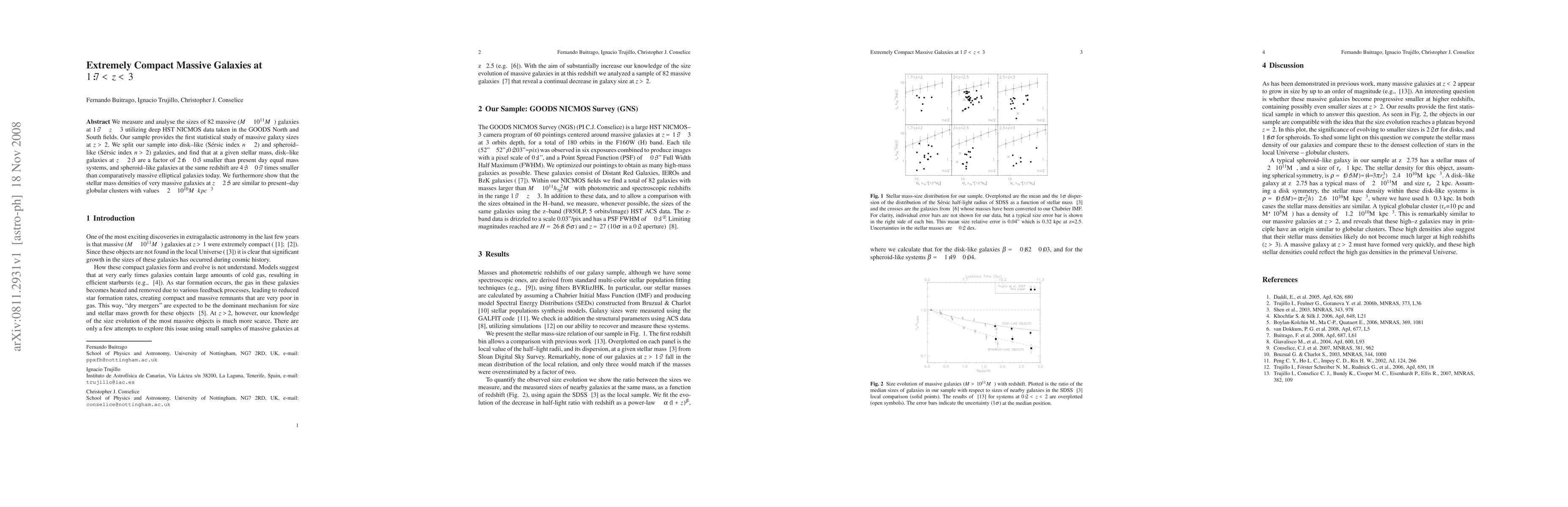 This study analyzes the sizes of 82 massive galaxies at redshifts 1.7<z<3 using HST NICMOS data, revealing that disk-like galaxies at z~2.3 are significantly smaller than their present-day counterparts, while spheroid-like galaxies at the same redshift are much smaller than today's massive elliptical galaxies.