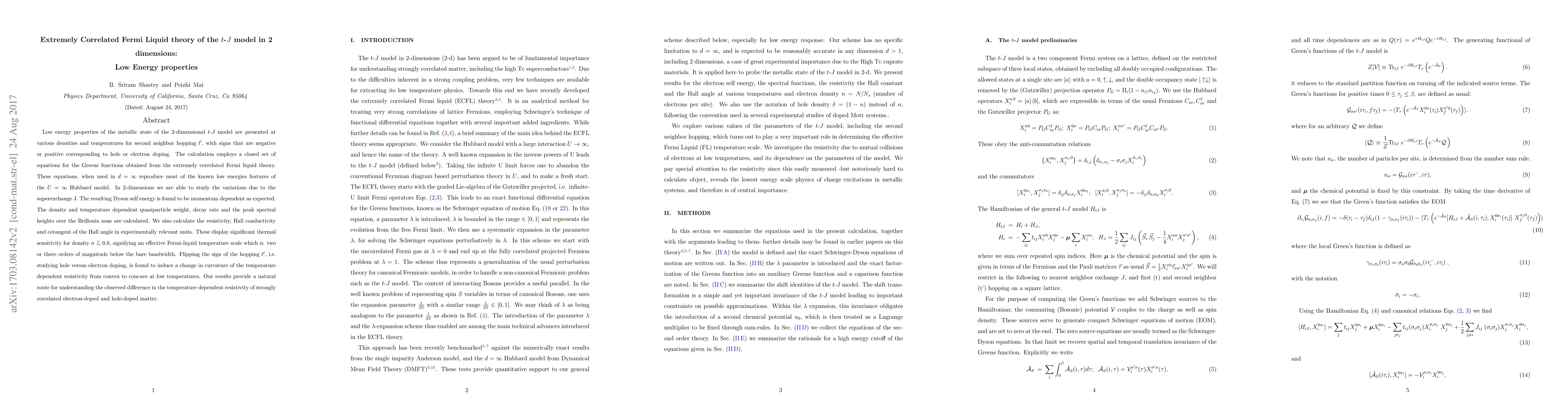 Low energy properties of the metallic state of the 2-dimensional tJ model are presented at various densities and temperatures for second neighbor hopping t', with signs that are negative or positive corresponding to hole or electron doping. The calculation employs a closed set of equations for the Greens functions obtained from the extremely correlated Fermi liquid theory. These equations, when used in $d=\infty$ reproduce most of the known low energies features of the $U=\infty$ Hubbard model. In 2-dimensions we are able to study the variations due to the superexchange J. The resulting Dyson self energy is found to be momentum dependent as expected. The density and temperature dependent quasiparticle weight, decay rate and the peak spectral heights over the Brillouin zone are calculated. We also calculate the resistivity, Hall conductivity and cotangent of the Hall angle in experimentally relevant units. These display significant thermal sensitivity for density n >~ 0.8, signifying an effective Fermi-liquid temperature scale which is two or three orders of magnitude below the bare bandwidth. Flipping the sign of the hopping t', i.e. studying hole versus electron doping, is found to induce a change in curvature of the temperature dependent resistivity from convex to concave at low temperatures. Our results provide a natural route for understanding the observed difference in the temperature dependent resistivity of strongly correlated electron-doped and hole-doped matter.