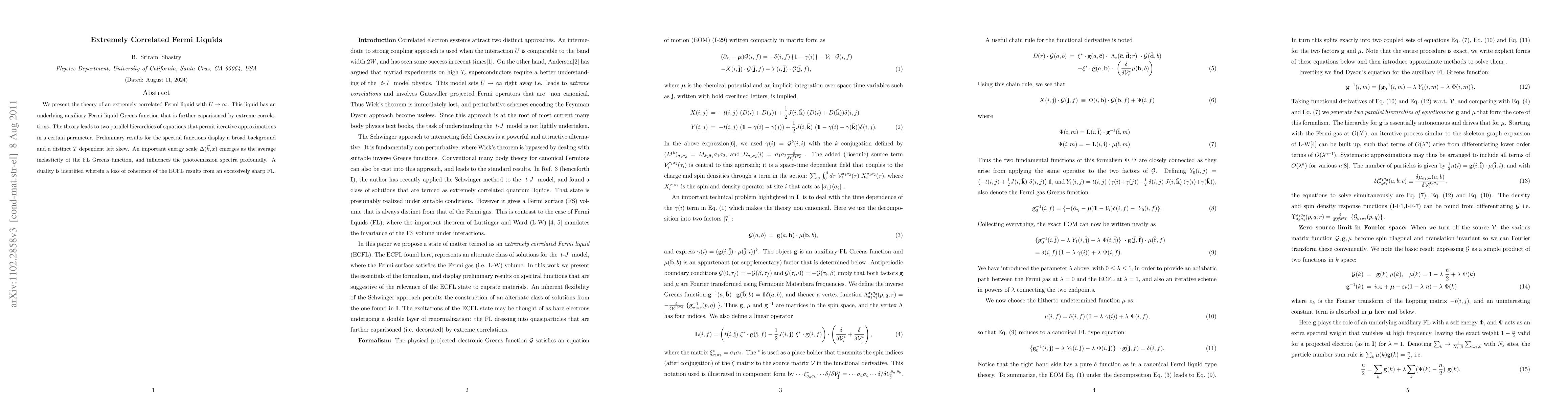 We present the theory of an extremely correlated Fermi liquid (ECFL) with $U\to \infty$. This liquid has an underlying Fermi liquid (FL) Greens function that is further caparisoned. The theory leads to two parallel hierarchies of equations that permit iterative approximations in a certain parameter. Preliminary results for the spectral functions display a broad background and a distinct $T$ dependent left skew. An important energy scale $\Delta(\vec{k},x)$ emerges as the average inelasticity of the FL Greens function, and influences the photoemission spectra profoundly. A duality is identified wherein an apparent loss of coherence of the ECFL results from an excessively sharp FL.