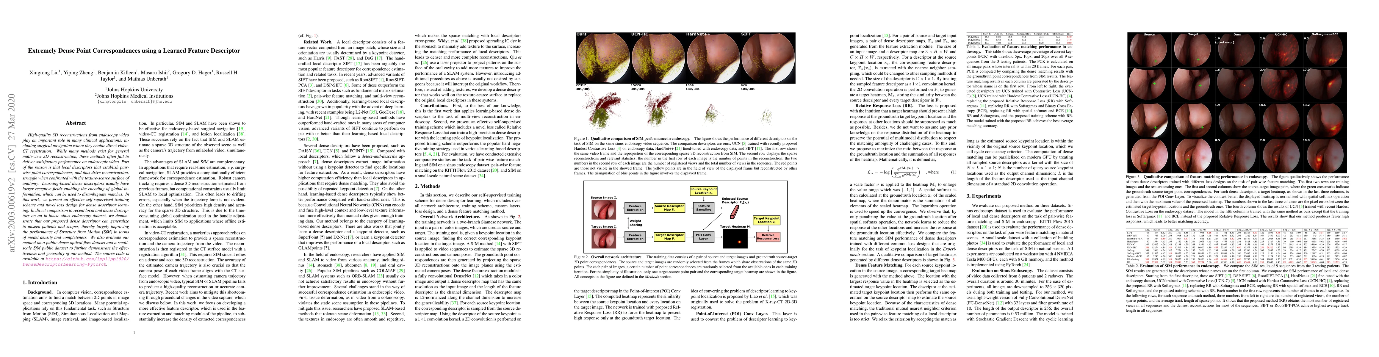 High-quality 3D reconstructions from endoscopy video play an important role in many clinical applications, including surgical navigation where they enable direct video-CT registration. While many methods exist for general multi-view 3D reconstruction, these methods often fail to deliver satisfactory performance on endoscopic video. Part of the reason is that local descriptors that establish pair-wise point correspondences, and thus drive reconstruction, struggle when confronted with the texture-scarce surface of anatomy. Learning-based dense descriptors usually have larger receptive fields enabling the encoding of global information, which can be used to disambiguate matches. In this work, we present an effective self-supervised training scheme and novel loss design for dense descriptor learning. In direct comparison to recent local and dense descriptors on an in-house sinus endoscopy dataset, we demonstrate that our proposed dense descriptor can generalize to unseen patients and scopes, thereby largely improving the performance of Structure from Motion (SfM) in terms of model density and completeness. We also evaluate our method on a public dense optical flow dataset and a small-scale SfM public dataset to further demonstrate the effectiveness and generality of our method. The source code is available at https://github.com/lppllppl920/DenseDescriptorLearning-Pytorch.