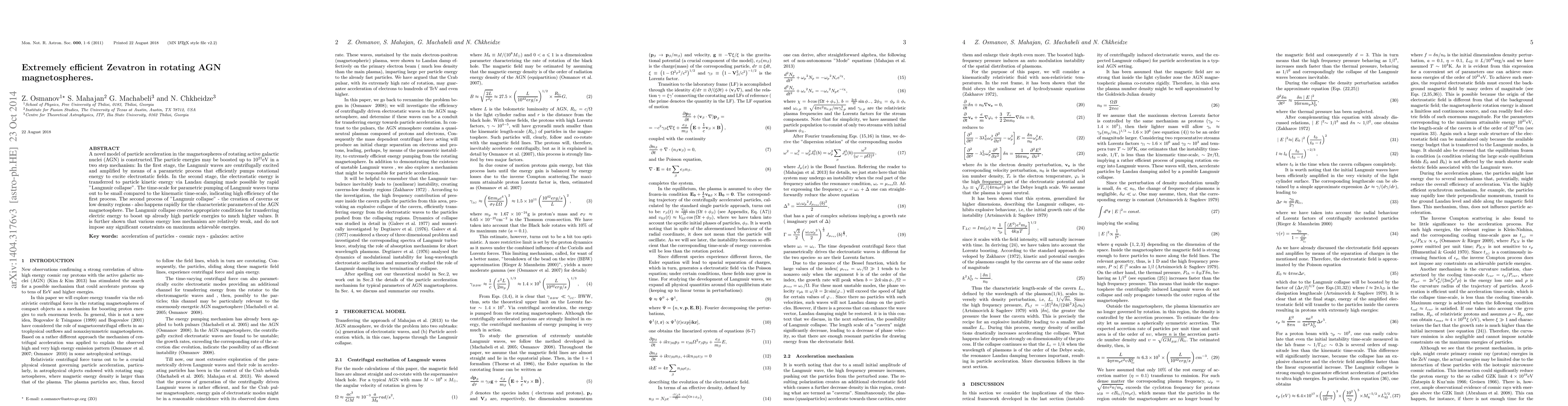 A novel model of particle acceleration in the magnetospheres of rotating active galactic nuclei (AGN) is constructed.The particle energies may be boosted up to $10^{21}$eV in a two step mechanism: In the first stage, the Langmuir waves are centrifugally excited and amplified by means of a parametric process that efficiently pumps rotational energy to excite electrostatic fields. In the second stage, the electrostatic energy is transferred to particle kinetic energy via Landau damping made possible by rapid "Langmuir collapse". The time-scale for parametric pumping of Langmuir waves turns out to be small compared to the kinematic time-scale, indicating high efficiency of the first process. The second process of "Langmuir collapse" - the creation of caverns or low density regions - also happens rapidly for the characteristic parameters of the AGN magnetosphere. The Langmuir collapse creates appropriate conditions for transferring electric energy to boost up already high particle energies to much higher values. It is further shown that various energy loss mechanism are relatively weak, and do not impose any significant constraints on maximum achievable energies.