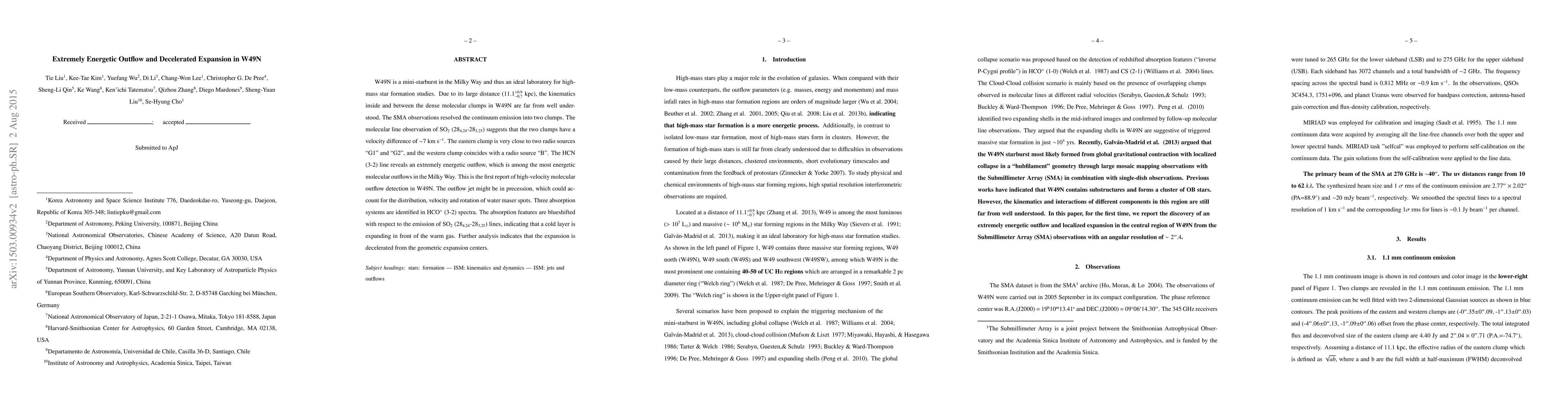 W49N is a mini-starburst in the Milky Way and thus an ideal laboratory for high-mass star formation studies. Due to its large distance (11.1$_{-0.7}^{+0.9}$ kpc), the kinematics inside and between the dense molecular clumps in W49N are far from well understood. The SMA observations resolved the continuum emission into two clumps. The molecular line observation of SO$_{2}$ (28$_{4,24}$-28$_{3,25}$) suggests that the two clumps have a velocity difference of $\sim$7 km~s$^{-1}$. The eastern clump is very close to two radio sources "G1" and "G2", and the western clump coincides with a radio source "B". The HCN (3-2) line reveals an extremely energetic outflow, which is among the most energetic molecular outflows in the Milky Way. This is the first report of high-velocity molecular outflow detection in W49N. The outflow jet might be in precession, which could account for the distribution, velocity and rotation of water maser spots. Three absorption systems are identified in HCO$^{+}$ (3-2) spectra. The absorption features are blueshifted with respect to the emission of SO$_{2}$ (28$_{4,24}$-28$_{3,25}$) lines, indicating that a cold layer is expanding in front of the warm gas. Further analysis indicates that the expansion is decelerated from the geometric expansion centers.