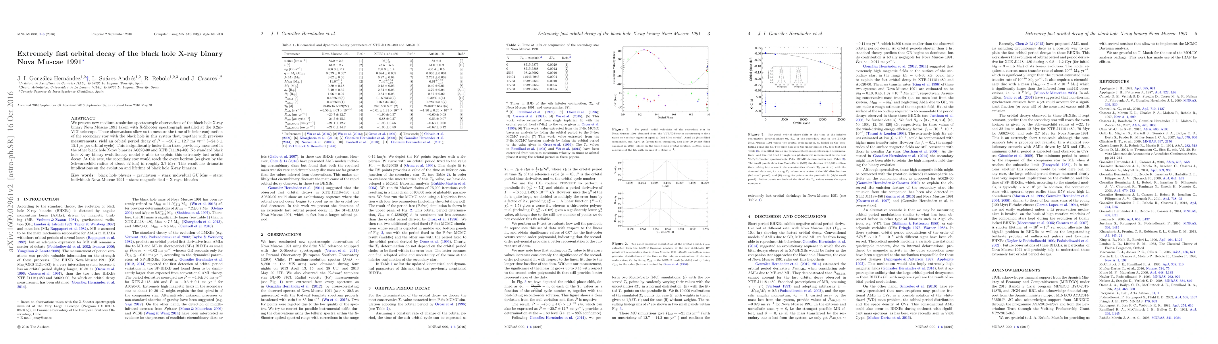 We present new medium-resolution spectroscopic observations of the black hole X-ray binary Nova Muscae 1991 taken with X-Shooter spectrograph installed at the 8.2m-VLT telescope. These observations allow us to measure the time of inferior conjunction of the secondary star with the black hole in this system that, together with previous measurements, yield an orbital period decay of $\dot P=-20.7\pm12.7$ ms yr$^{-1}$ ($-24.5\pm15.1$ $\mu $s per orbital cycle). This is significantly faster than those previously measured in the other black hole X-ray binaries A0620-00 and XTE J1118+480. No standard black hole X-ray binary evolutionary model is able to explain this extremely fast orbital decay. At this rate, the secondary star would reach the event horizon (as given by the Schwarzschild radius of about 32 km) in roughly 2.7 Myr. This result has dramatic implications on the evolution and lifetime of black hole X-ray binaries.