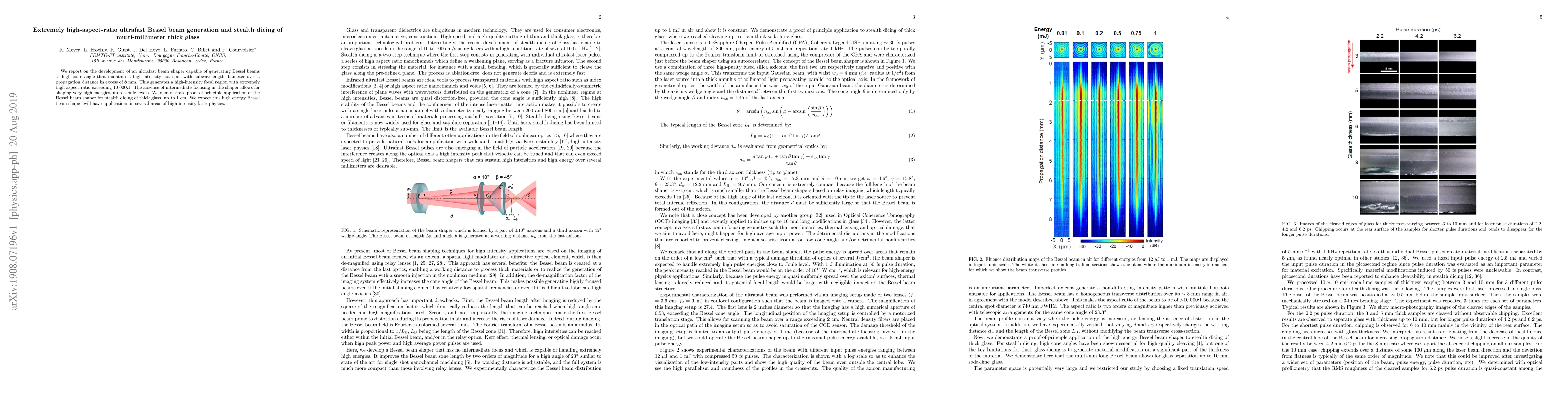 This paper presents an ultrafast beam shaper that generates Bessel beams with high cone angles and maintains a high-intensity focal region over long distances, enabling stealth dicing of multi-millimeter thick glass. The shaper can handle high energies, up to Joule levels, without intermediate focusing.