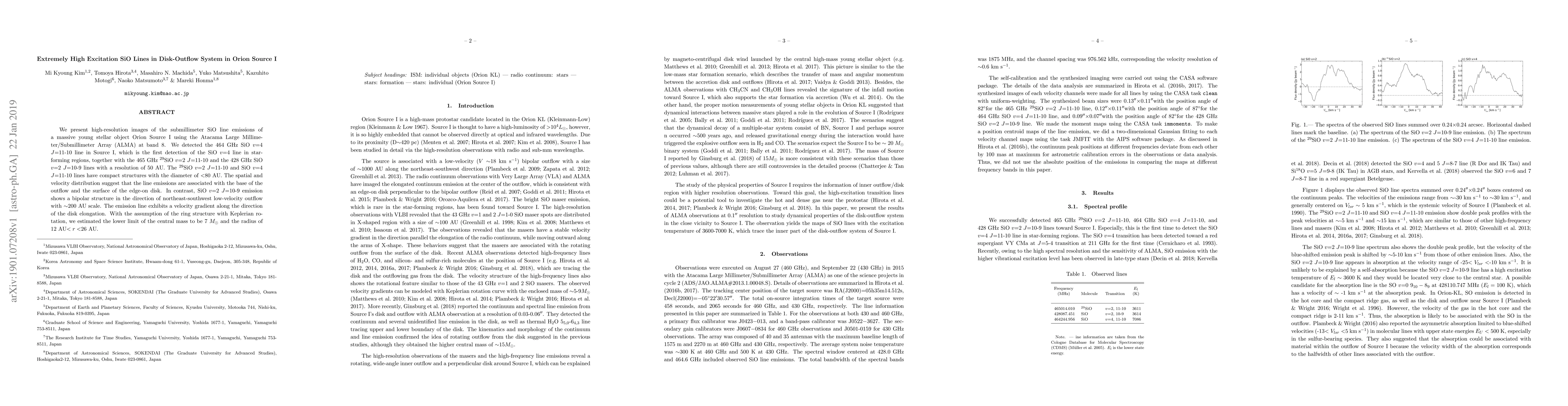 This study uses ALMA to detect high-excitation SiO lines in Orion Source I, revealing the first detection of the SiO v=4 line in star-forming regions. The findings suggest these lines are associated with the outflow base and the disk's edge, with a lower limit of 7 solar masses for the central mass and a disk radius of 12-26 AU.