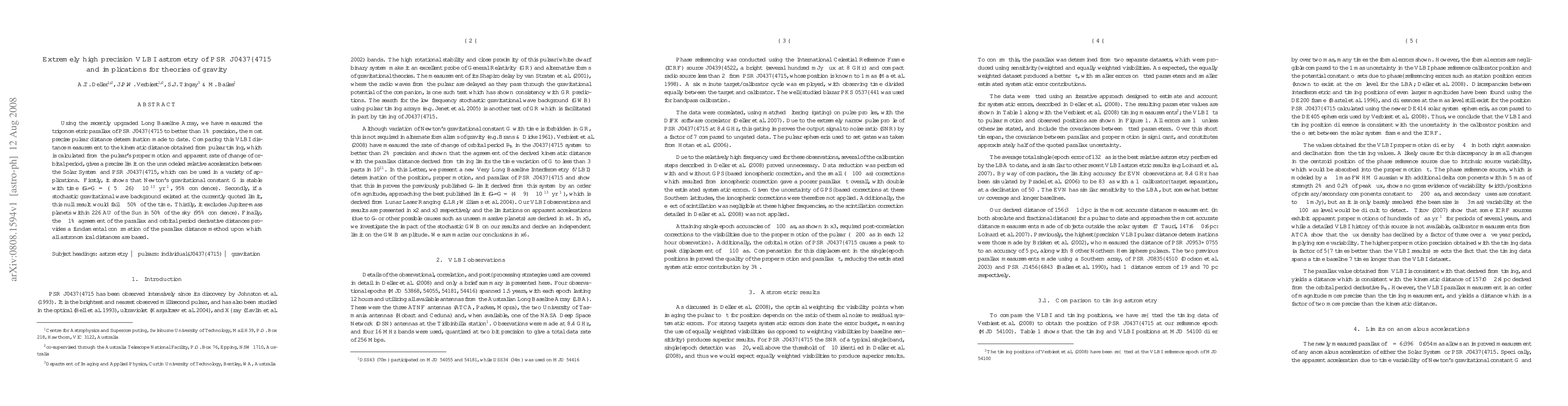 This study uses high-precision VLBI astrometry to measure the trigonometric parallax of PSR J0437-4715, achieving the most accurate pulsar distance determination to date. The results confirm the stability of Newton's gravitational constant G and provide strong constraints against the existence of Jupiter-mass planets near the Sun, while also supporting the reliability of the parallax distance method.