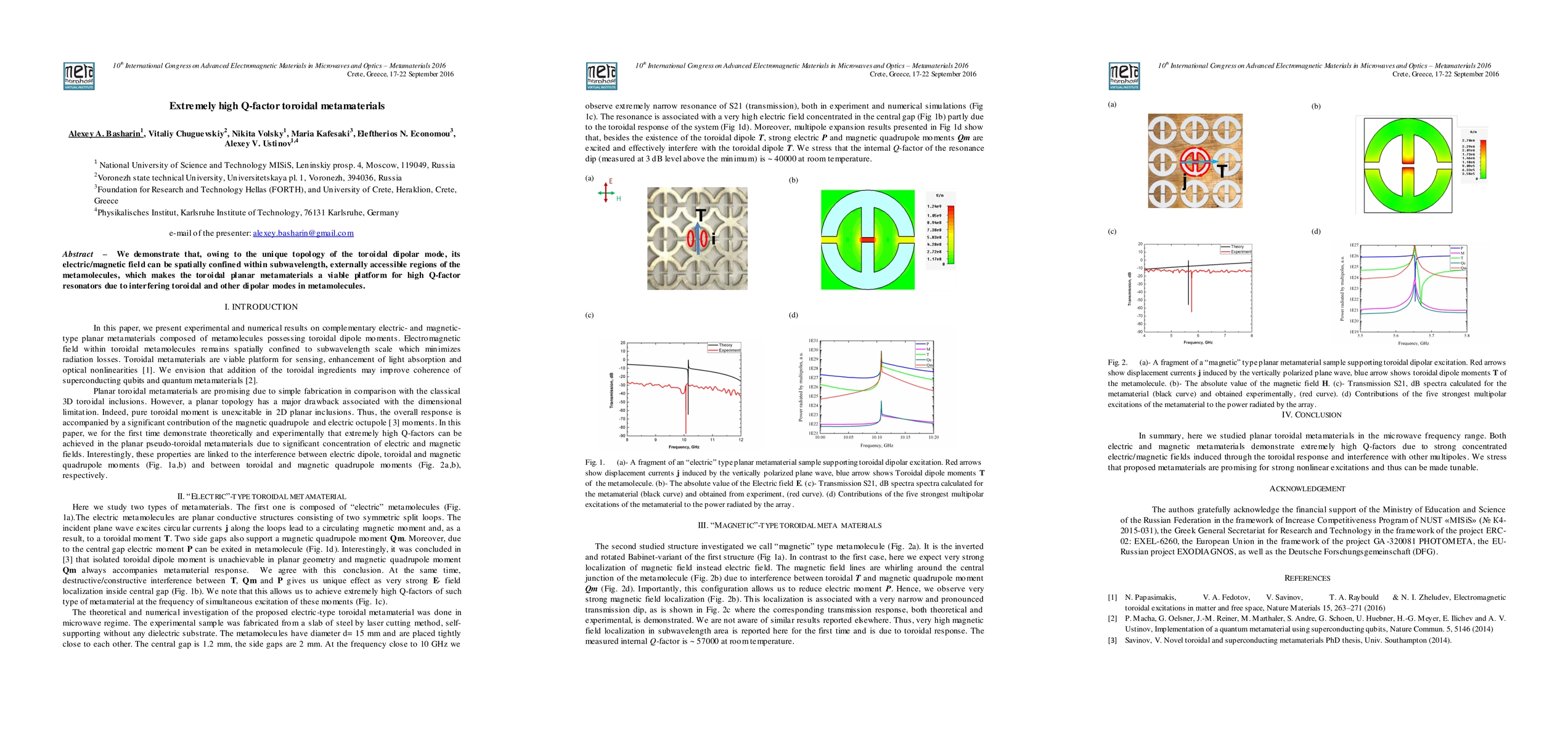 This paper demonstrates that toroidal metamaterials can achieve extremely high Q-factors due to the unique topology of toroidal dipolar modes, enabling subwavelength spatial confinement of electric/magnetic fields and interference of toroidal and other dipolar modes within metamolecules.