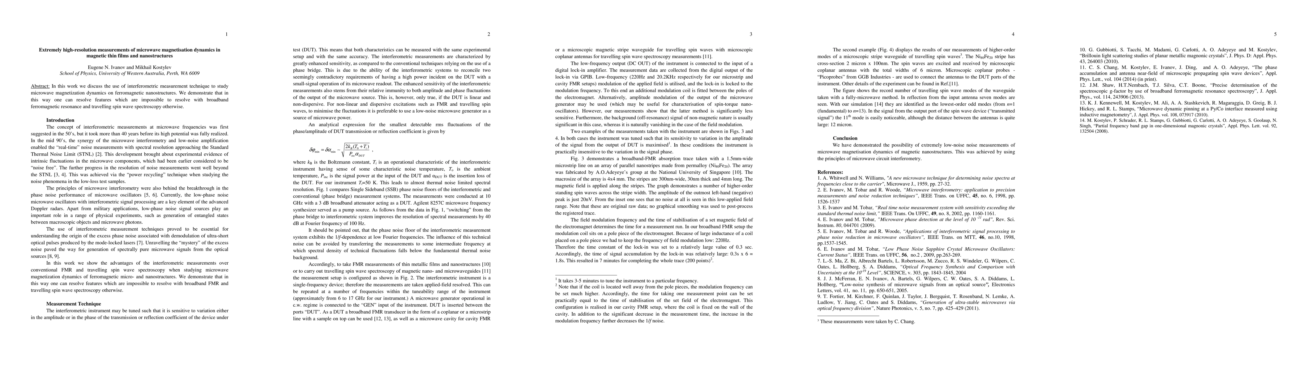 In this work we discuss the use of interferometric measurement technique to study microwave magnetization dynamics on ferromagnetic nanostructures. We demonstrate that in this way one can resolve features which are impossible to resolve with broadband ferromagnetic resonance and traveling spin wave spectroscopy otherwise.