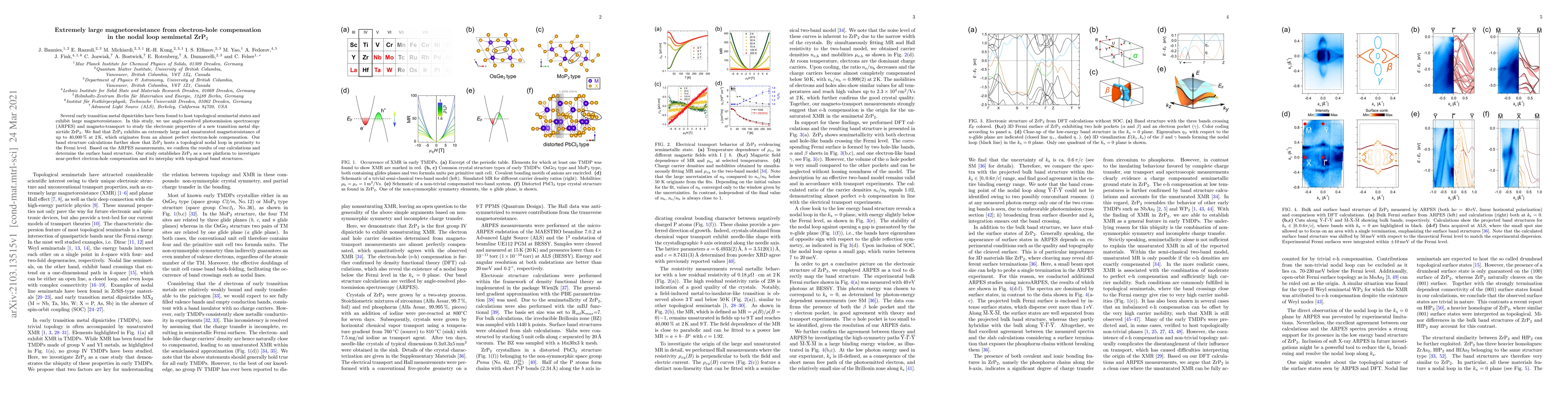 Several early transition metal dipnictides have been found to host topological semimetal states and exhibit large magnetoresistance. In this study, we use angle-resolved photoemission spectroscopy (ARPES) and magneto-transport to study the electronic properties of a new transition metal dipnictide ZrP$_2$. We find that ZrP$_2$ exhibits an extremely large and unsaturated magnetoresistance of up to 40,000 % at 2 K, which originates from an almost perfect electron-hole compensation. Our band structure calculations further show that ZrP$_2$ hosts a topological nodal loop in proximity to the Fermi level. Based on the ARPES measurements, we confirm the results of our calculations and determine the surface band structure. Our study establishes ZrP$_2$ as a new platform to investigate near-perfect electron-hole compensation and its interplay with topological band structures.