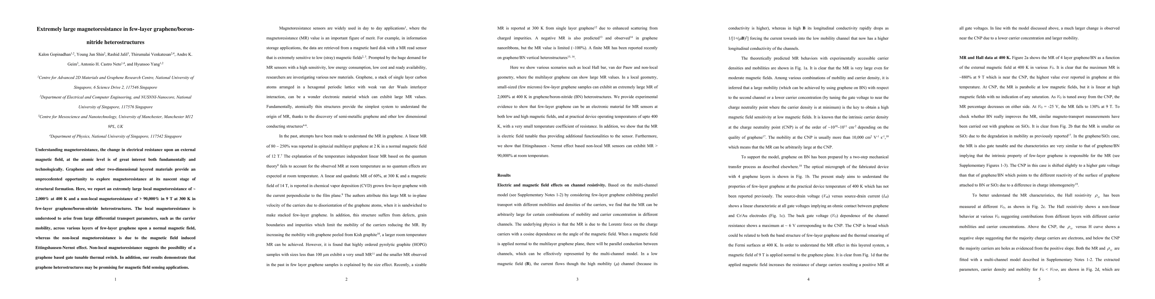This paper reports extremely large magnetoresistance in few-layer graphene/boron-nitride heterostructures, achieving local values of ~2,000% at 400 K and non-local values exceeding 90,000% at 300 K. The findings suggest potential for magnetic field sensing and tunable thermal switches.
