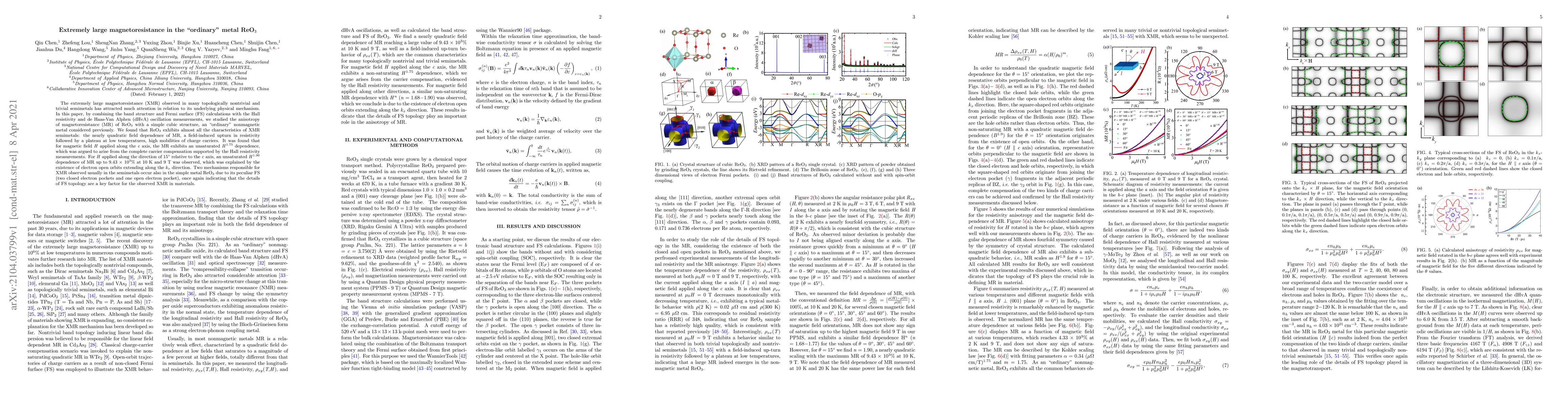The extremely large magnetoresistance (XMR) observed in many topologically nontrivial and trivial semimetals has attracted much attention in relation to its underlying physical mechanism. In this paper, by combining the band structure and Fermi surface (FS) calculations with the Hall resistivity and de Haas-Van Alphen (dHvA) oscillation measurements, we studied the anisotropy of magnetoresistance (MR) of ReO$_3$ with a simple cubic structure, an "ordinary" nonmagnetic metal considered previously. We found that ReO$_3$ exhibits almost all the characteristics of XMR semimetals: the nearly quadratic field dependence of MR, a field-induced upturn in resistivity followed by a plateau at low temperatures, high mobilities of charge carriers. It was found that for magnetic field \emph{H} applied along the \emph{c} axis, the MR exhibits an unsaturated \emph{H}$^{1.75}$ dependence, which was argued to arise from the complete carrier compensation supported by the Hall resistivity measurements. For \emph{H} applied along the direction of 15$^\circ$ relative to the \emph{c} axis, an unsaturated \emph{H}$^{1.90}$ dependence of MR up to 9.43~$\times$~$10^3$$\%$ at 10~K and 9~T was observed, which was explained by the existence of electron open orbits extending along the $k_{x}$ direction. Two mechanisms responsible for XMR observed usually in the semimetals occur also in the simple metal ReO$_3$ due to its peculiar FS (two closed electron pockets and one open electron pocket), once again indicating that the details of FS topology are a key factor for the observed XMR in materials.