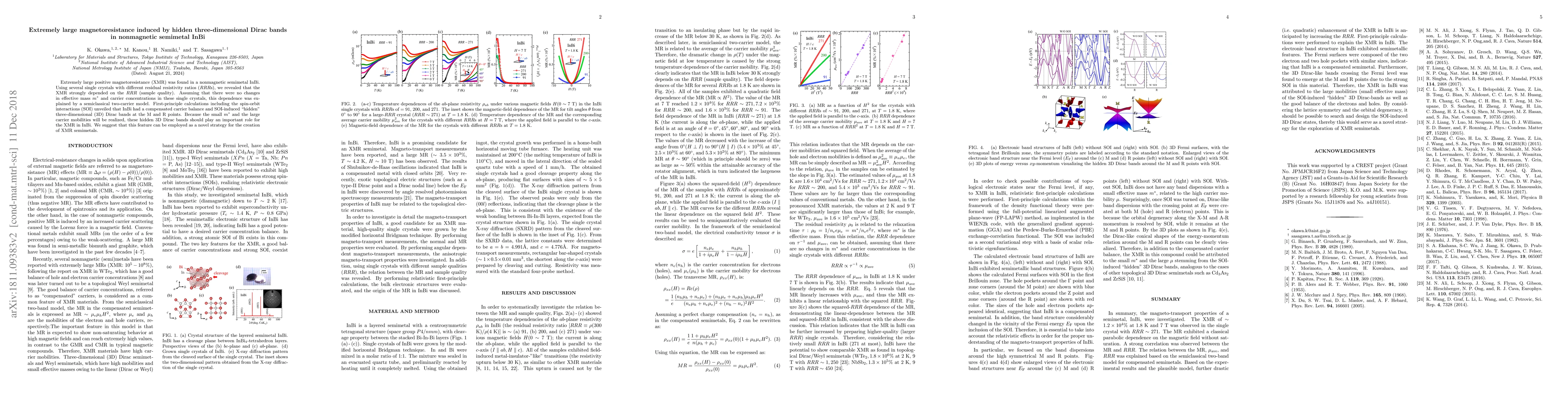 The research discovered extremely large positive magnetoresistance (XMR) in the nonmagnetic semimetal InBi, attributing this to 'hidden' three-dimensional Dirac bands induced by spin-orbit interactions. This effect is suggested to be controllable via sample quality, presenting a novel strategy for creating XMR semimetals.