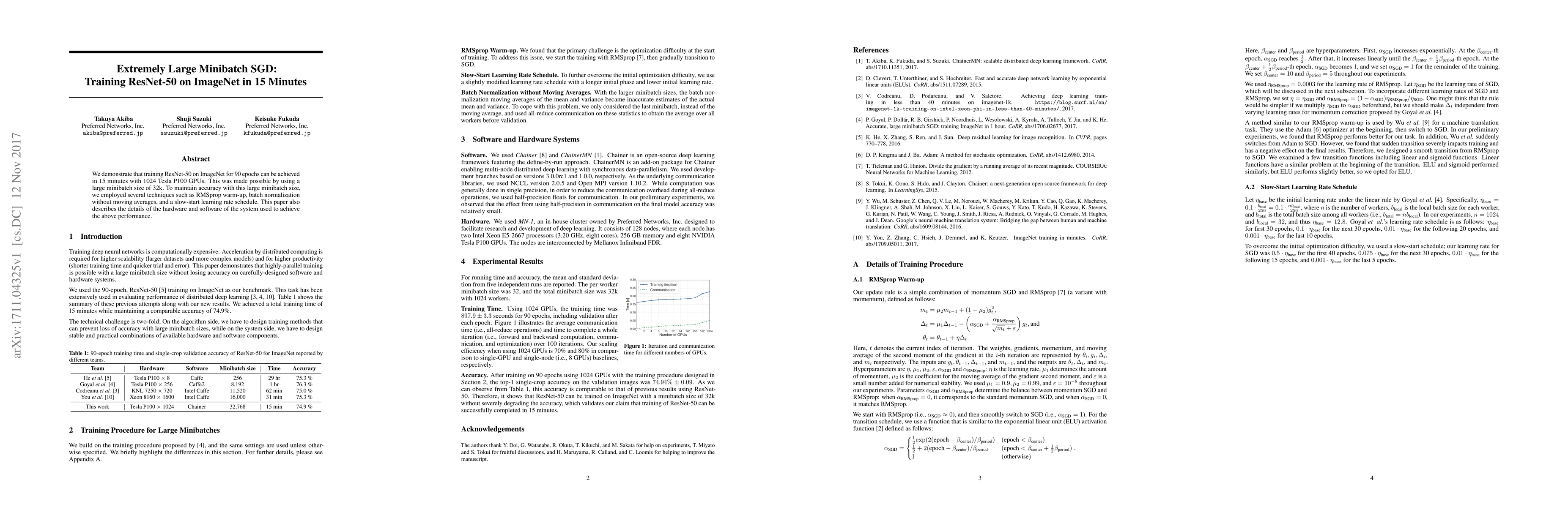 We demonstrate that training ResNet-50 on ImageNet for 90 epochs can be achieved in 15 minutes with 1024 Tesla P100 GPUs. This was made possible by using a large minibatch size of 32k. To maintain accuracy with this large minibatch size, we employed several techniques such as RMSprop warm-up, batch normalization without moving averages, and a slow-start learning rate schedule. This paper also describes the details of the hardware and software of the system used to achieve the above performance.
