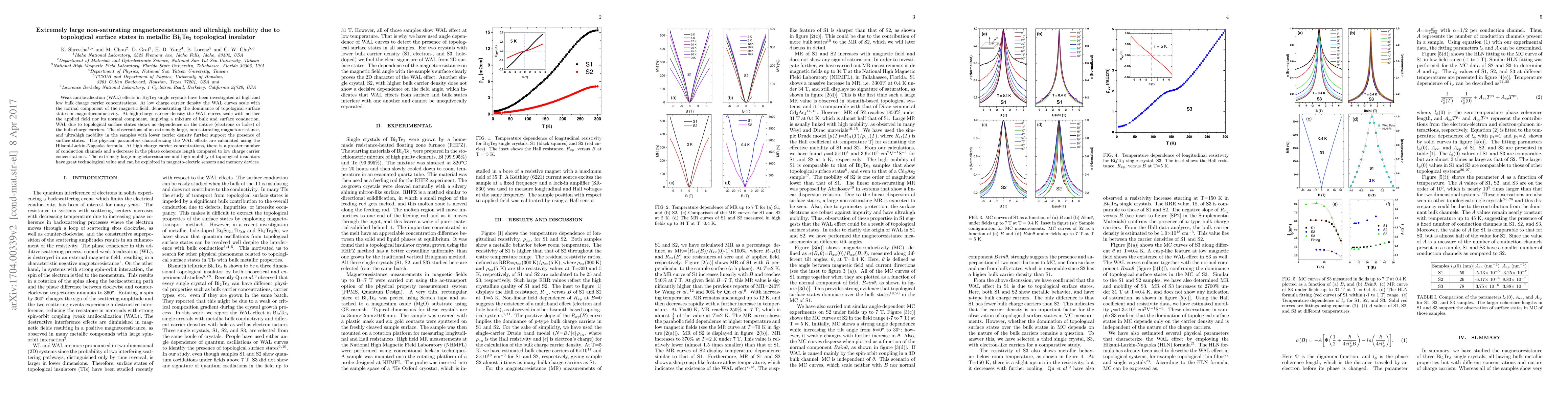 This paper investigates weak antilocalization (WAL) effects in Bi2Te3 topological insulators, revealing that low charge carrier densities highlight the dominance of topological surface states, leading to extremely large non-saturating magnetoresistance and ultrahigh mobility. At high carrier densities, both bulk and surface conduction contribute, reducing phase coherence length.