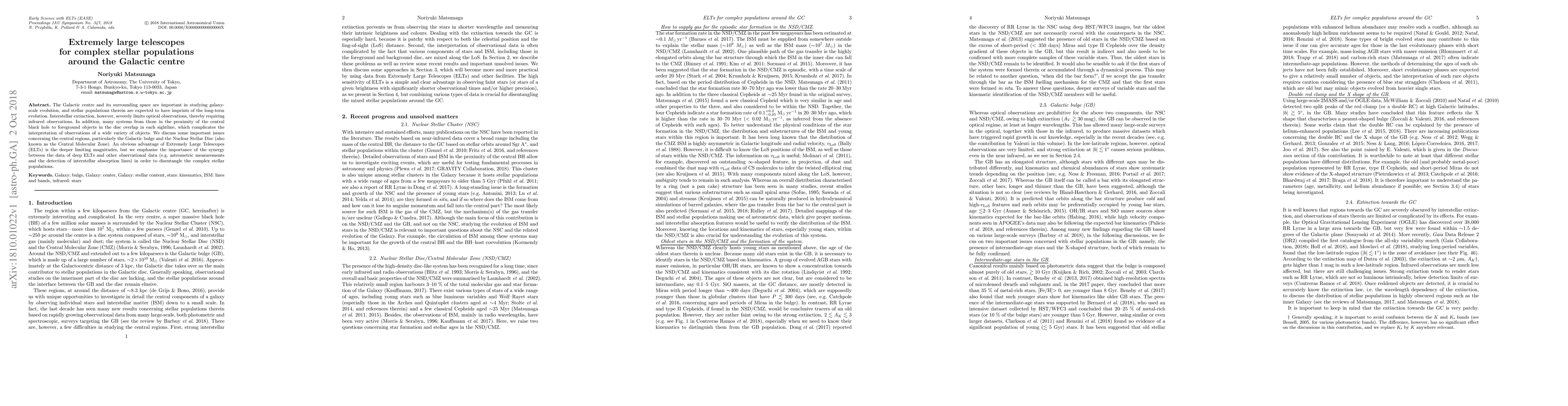 This paper discusses the use of Extremely Large Telescopes (ELTs) to study complex stellar populations around the Galactic centre, emphasizing the need for infrared observations due to interstellar extinction and the importance of combining ELT data with other observational data to disentangle overlapping stellar populations.