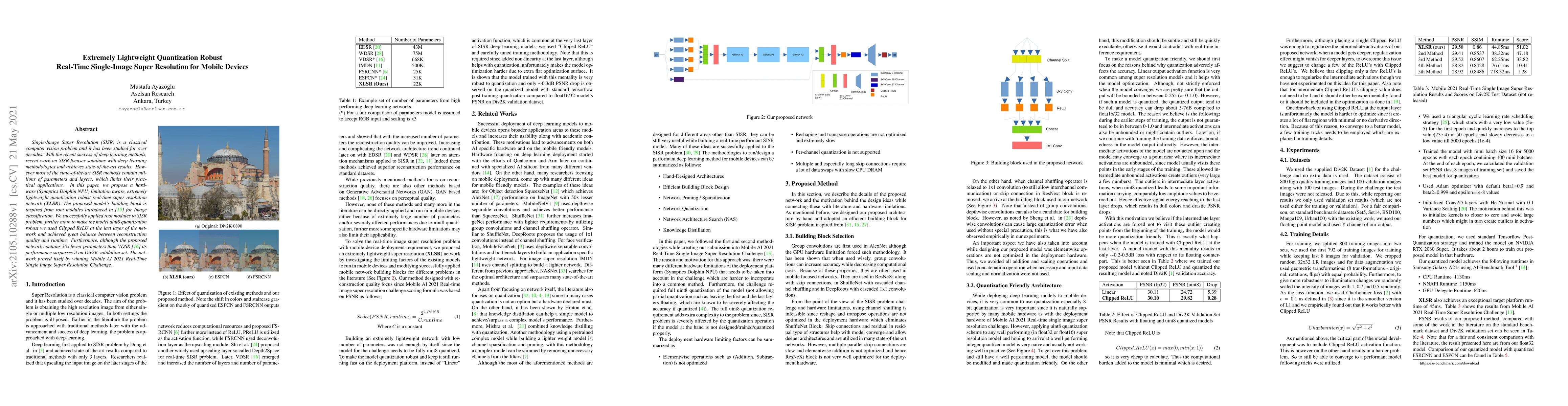 This paper proposes an extremely lightweight and quantization robust real-time single-image super resolution network (XLSR) for mobile devices, achieving state-of-the-art results with 30x fewer parameters than existing methods while maintaining superior reconstruction quality. The model utilizes root modules from image classification and Clipped ReLU for uint8 quantization robustness.