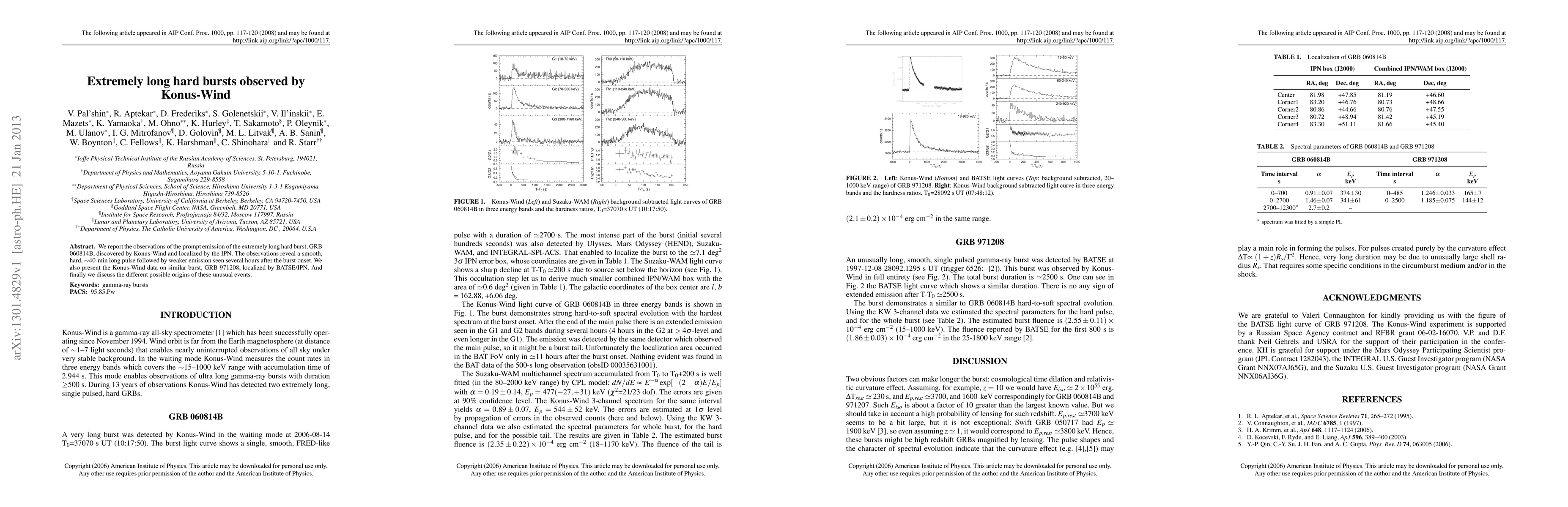 The research paper presents observations of two extremely long hard gamma-ray bursts, GRB 060814B and GRB 971208, detected by Konus-Wind. These bursts exhibit unique characteristics, with GRB 060814B displaying a 40-minute hard pulse followed by weaker emission, and GRB 971208 showing similar patterns. The paper discusses possible origins of these unusual events.